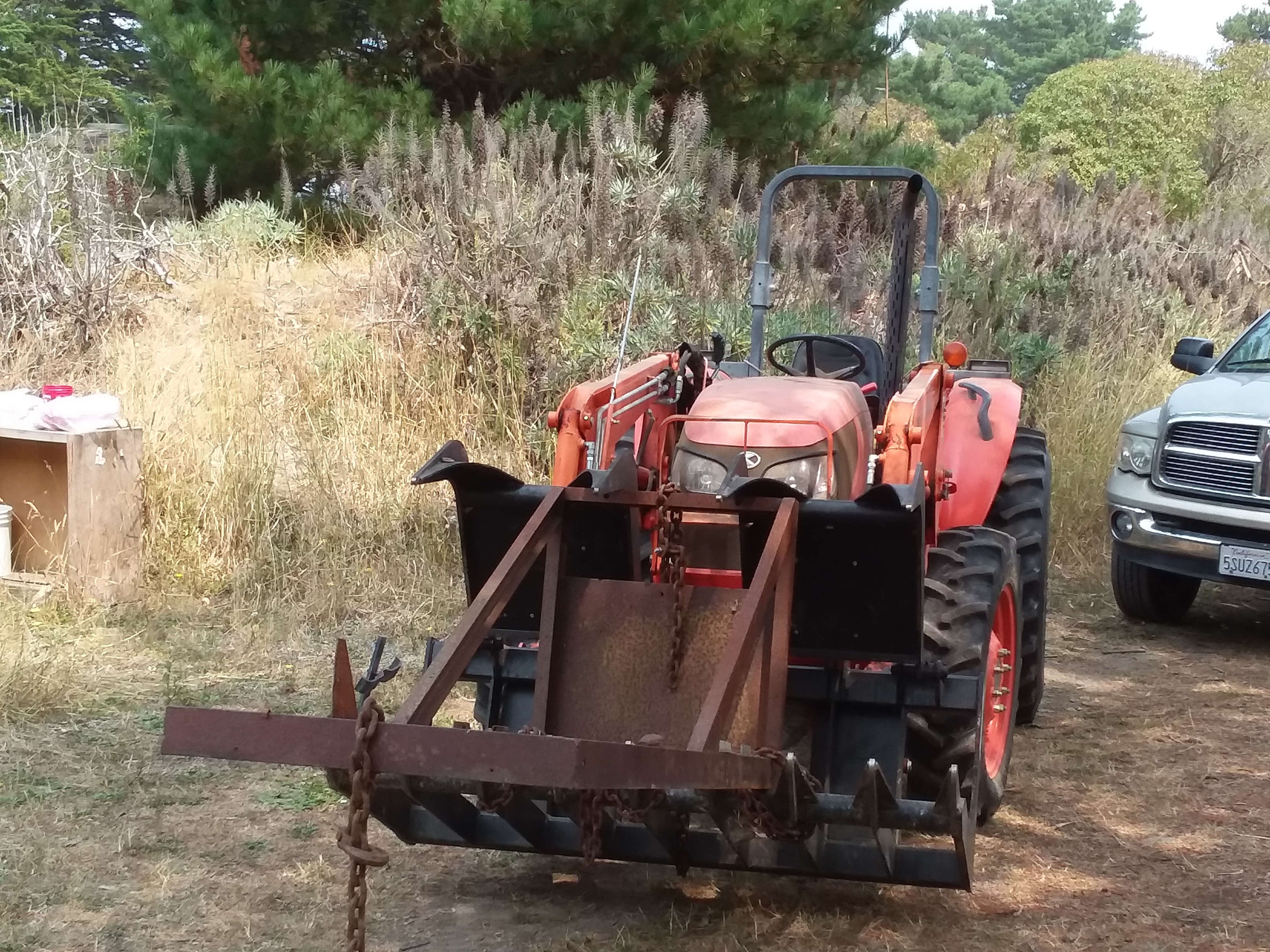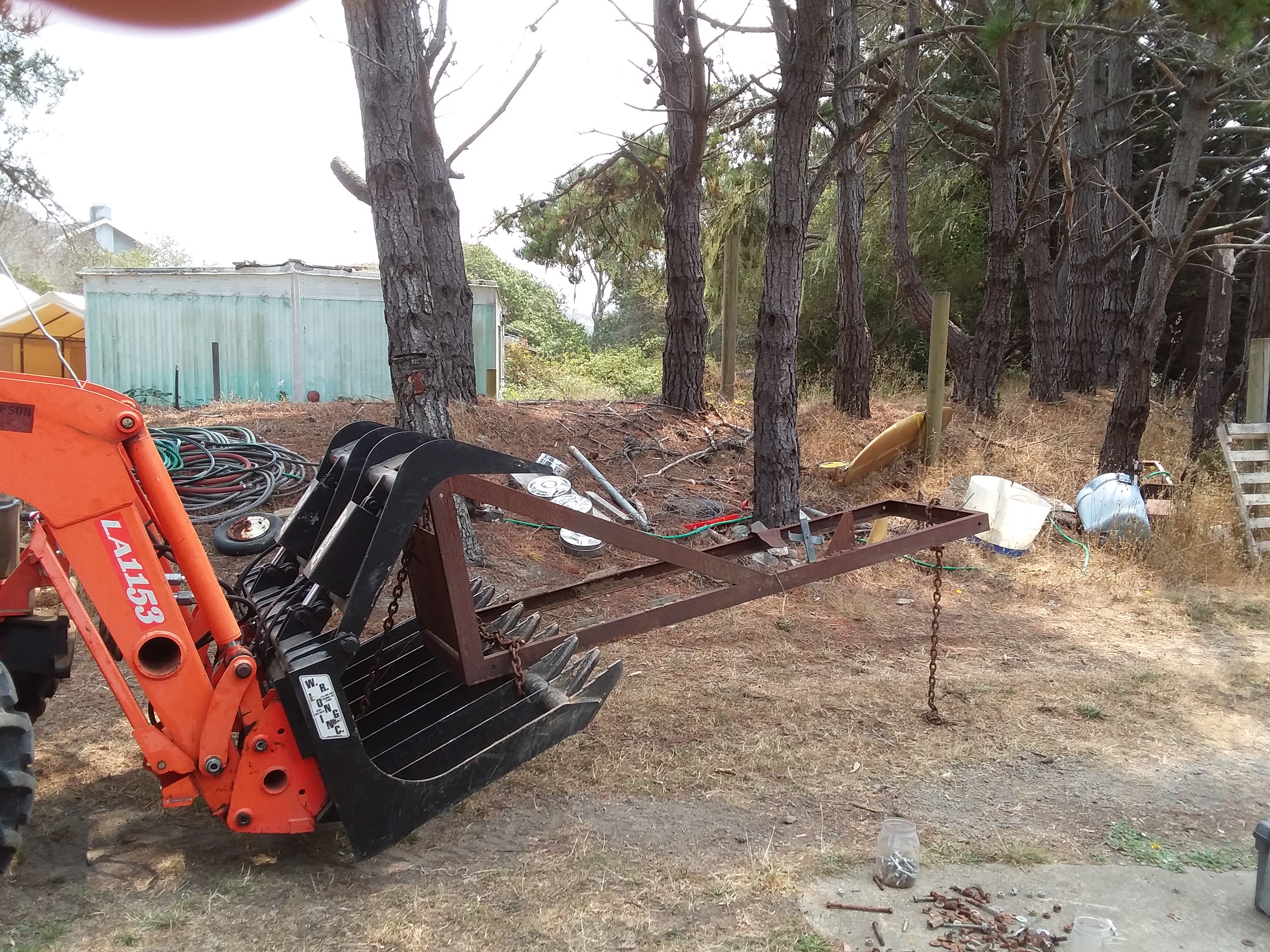 I bought a used poly water tank 10' 2" dia x 76" from a neighbor 3 miles away with the understanding that the pump & well service were to load it on to my trailer, as they are equipped with a boom crane on their truck. I arrived with my trailer and they said the tank won't fit on my trailer, I had taken my wider flat bed trailer 78 " width between the sides, the crew said "Oh the tank won't fit its to wide. I explained that I had measured it and it would fit. I had planned to give them 50 bucks for their trouble even though it was arranged up front as part of the job by my neighbor. They just wanted to cut up old tank with a sawzall. I didn't want to argue with them. I returned next day with my tractor and a simple (rube goldburg) jib crane. I found this old equipment rack in my metal scrap pile & secured it with chains to my grapple and away I went. I just had enough reach to load the tank other wise I would have gone to plan B. Anyway pictures of Grapple with Jib crane & the tank. I am going to send the pic to the crew that said it would not fit.