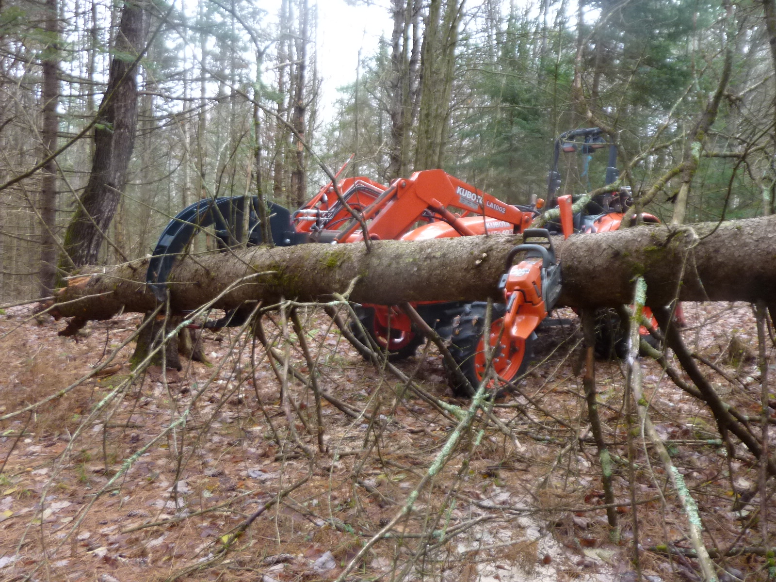 I was headed down into the woods to do some work this morning when I found a fallen tree blocking my way. It must have come down Saturday afternoon in the high winds we had with a strong cold front that came thru. Went from 55 to 35 in about an hour. If this wasn't a grapple job waiting to happen I don't know what is.