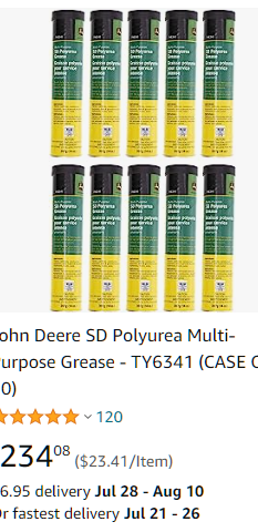 No John Deere Green polyurea or Lucas green polyurea grease anywhere.