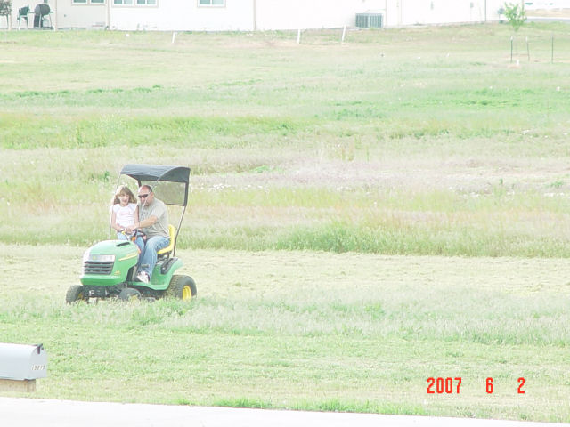 Yesterday, just after sundown but before it got dark, I started to the grocery store and a couple of blocks from the house, I saw a lady on a riding lawnmower. When I first saw her, she was going straight away from me, so I was seeing her from the back and the thing that attracted my attention was the fact that she was holding both hands out from her body about as far as she could reach. Then, just as I passed by, the mower turned toward the street and I saw that she had a child, no more than 2 or 3 years old, sitting in her lap doing the steering.