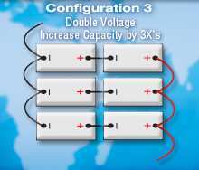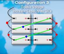To prove my point, take a small gauge wire and touch it to any two of the connection points as seen in configuration 3. There will be an electrical arc that will immediately burn out your small wire. Be sure to wear welding gloves and have on a full face mask, helmet and jacket when you do this because one or more of the batteries may explode.
