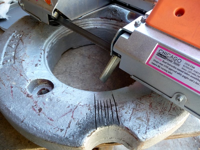 Here's a picture of the first-pass cuts I made in some weights to modify them for my wheels. I went back and cut deeper but I don't have a picture for that.