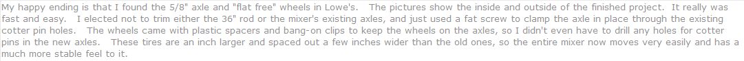 Yeah, well I did some Googling, a lot of it actually and although I didn't come up with that thread, it's not much help. Wrong mixer, and it tells you in general terms HOW to replace the wheels (as if!), but doesn't tell you which ones you can find to use.