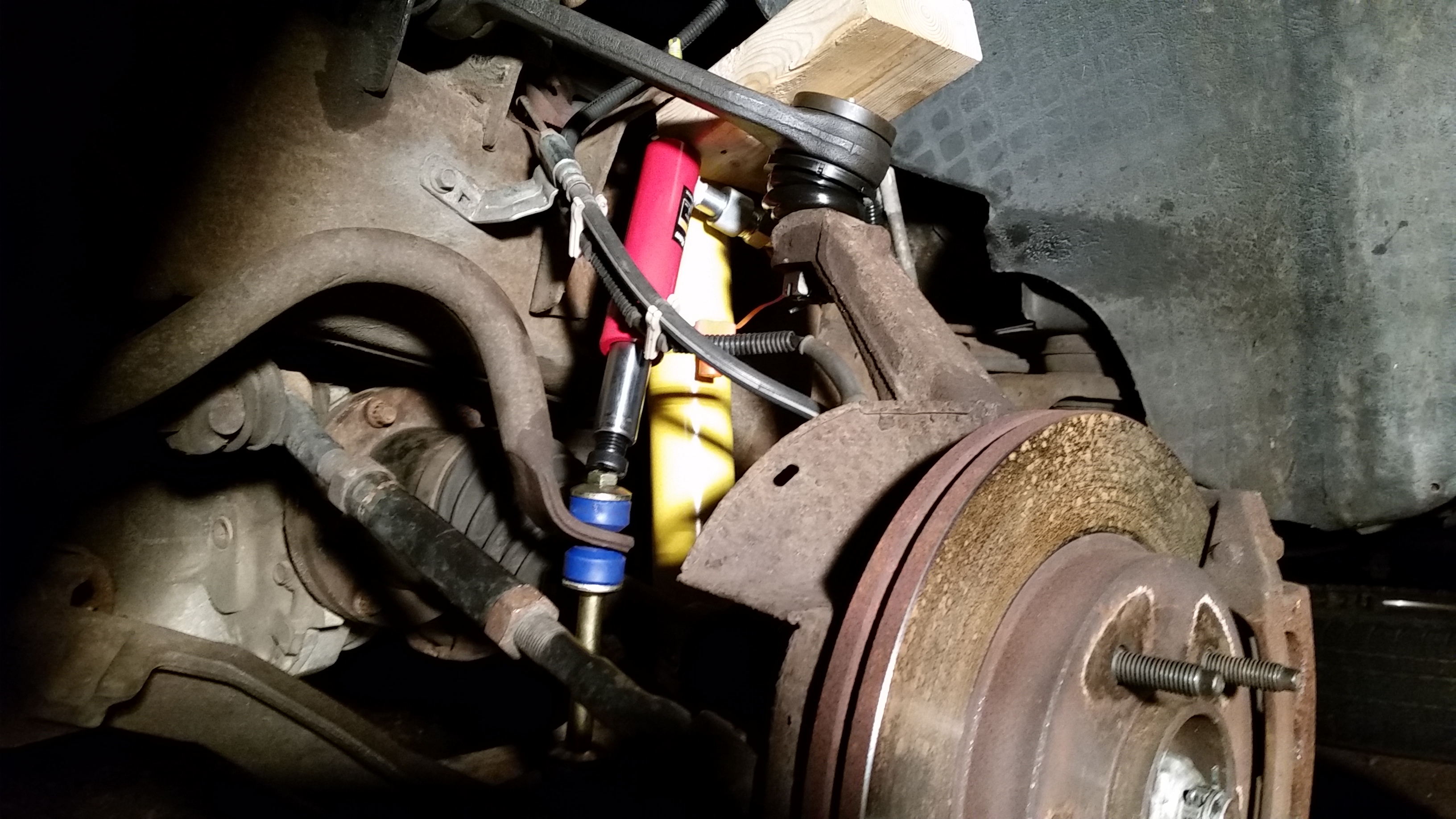 Replacing the link ... I don't care how big a boy you are ... you can't mash down to compress the bushing enough to get the nut started. Puller hydraulic kit to the rescue! This worked slick! I was able to push down with the small ram in the puller kit and compress these new bushings enough to get the nut started by myself. Now a real mechanic probably has another trick to do this but I'm not the sharpest knife in the drawer so this is the solution I devised: