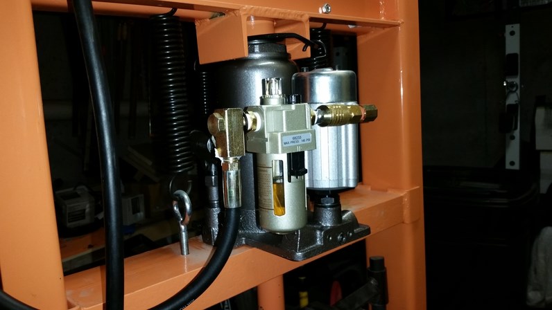 Decided to swap out the original HF 20 ton press jack with the HF 20 ton air jack. It was on sale and I had a 20% coupon so I couldn't pass it up. Also added in an inline oil feed. Makes using the metal brake so much faster! :thumbsup: