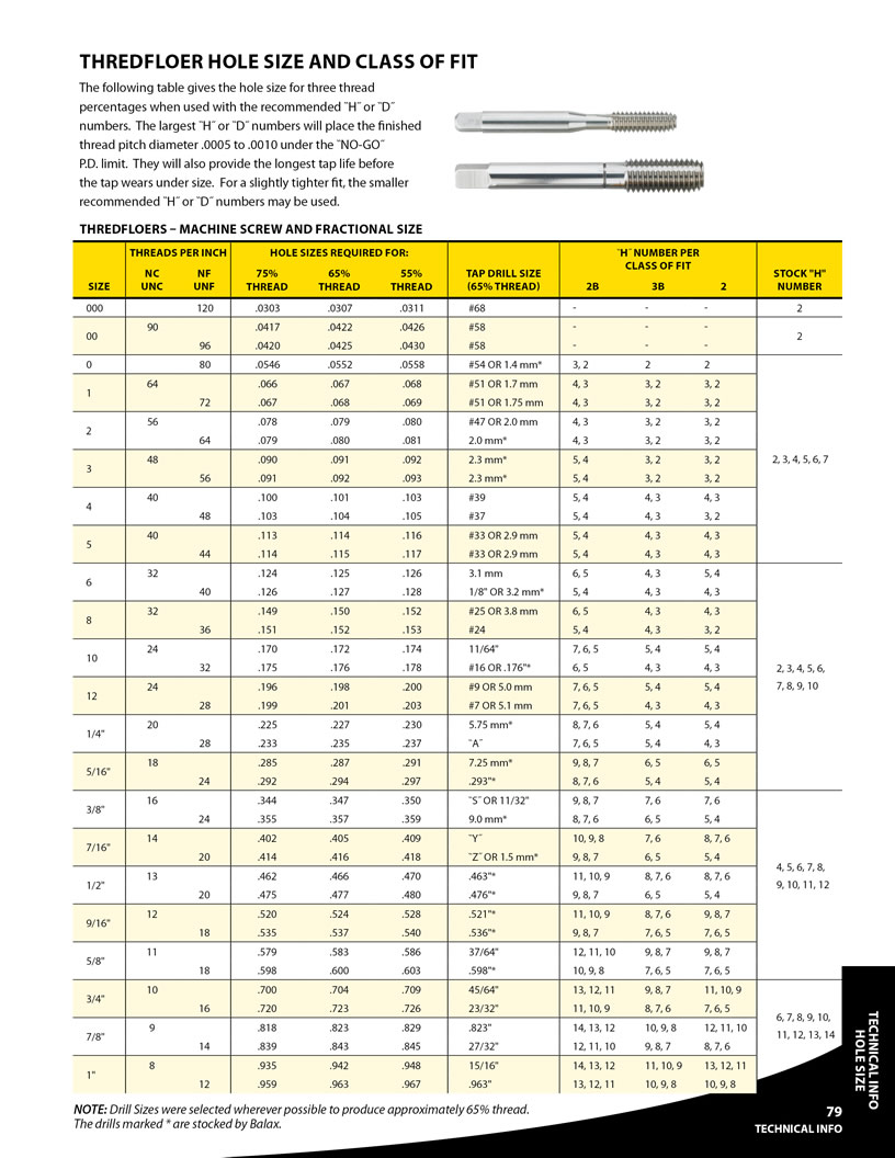 Most tap drill charts give a "one size fits all" drill size. I use charts like the two that are attached, that allow you to make a more informed choice about what size hole to drill. The Thredfloer chart shows different drill sizes for different amounts of thread engagement, and the Starrett chart shows continuous drill sizes in relation to fastener sizes.