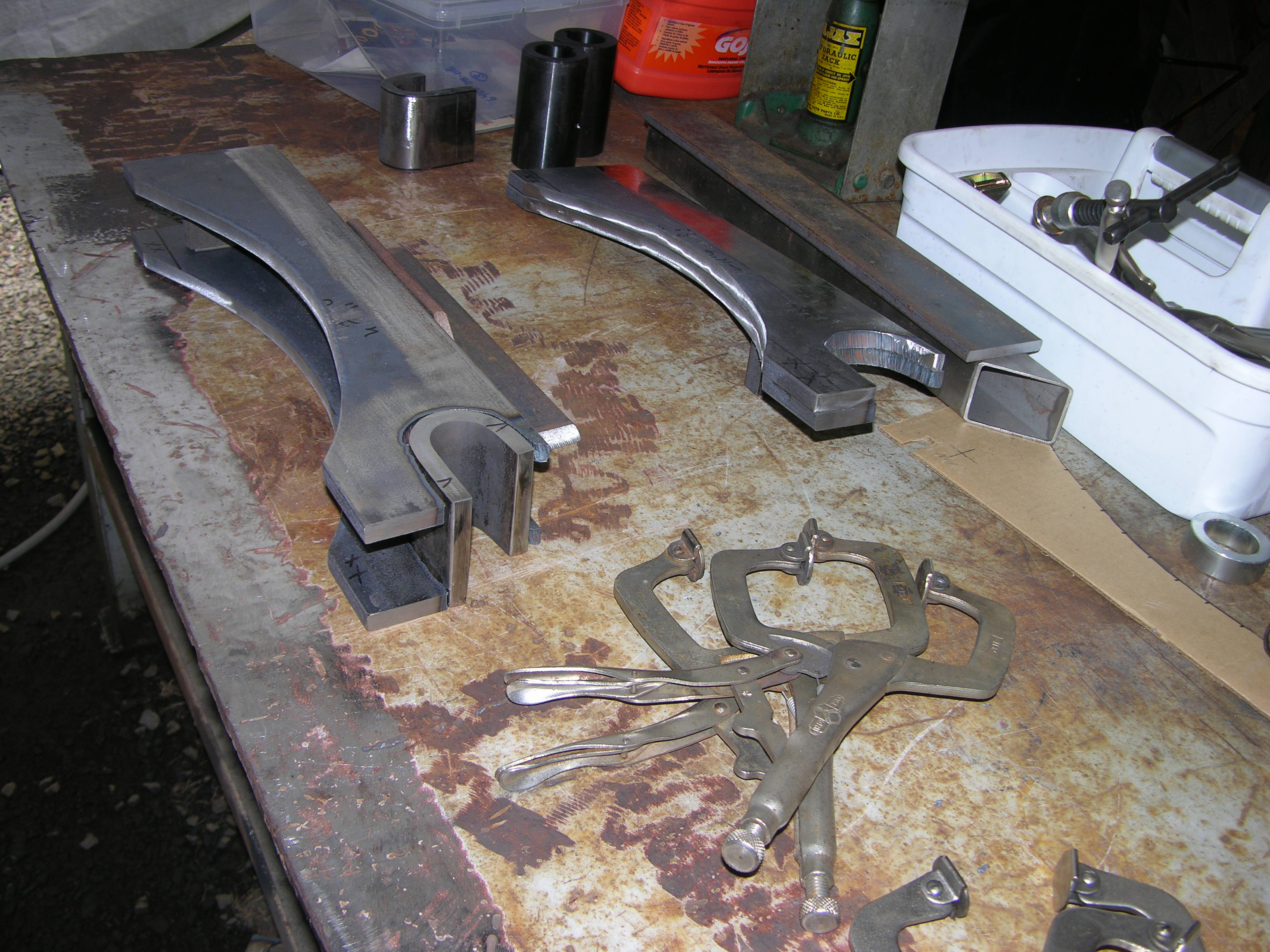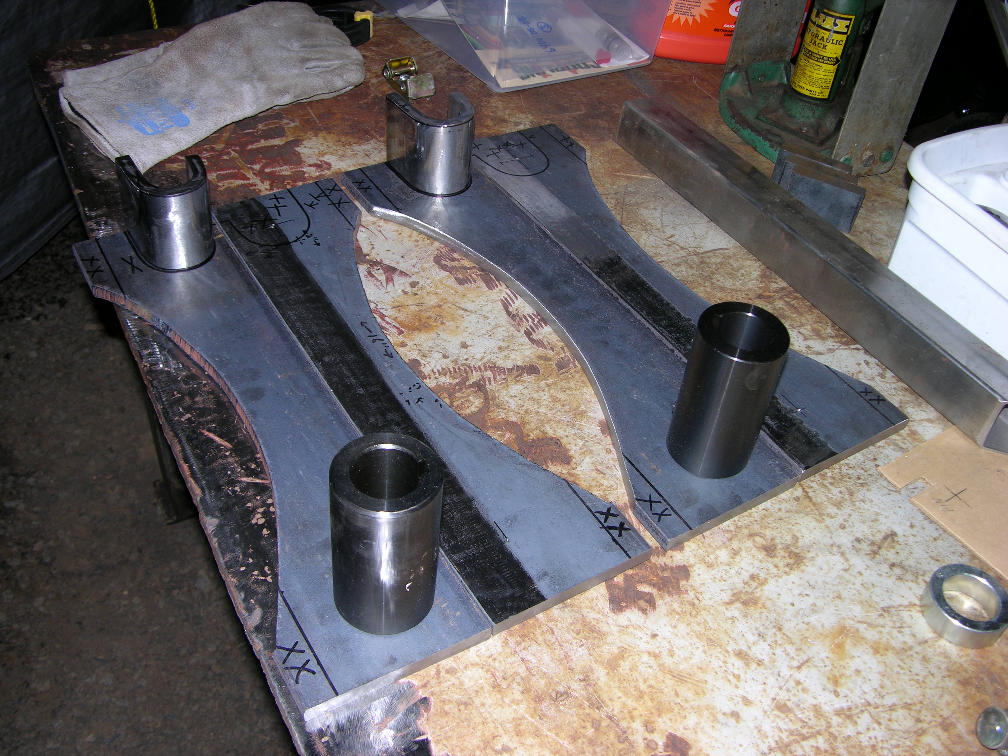 The long radius in the plates is just to clear the curved back of the original 1 yd bucket; other implements (grapple, forks, brush forks, 3ph quick hitch, etc) may not need that. The "U" brackets are only needed on the main loader mounts, any attachments would just be 1-1/2" pins spaced same as original.