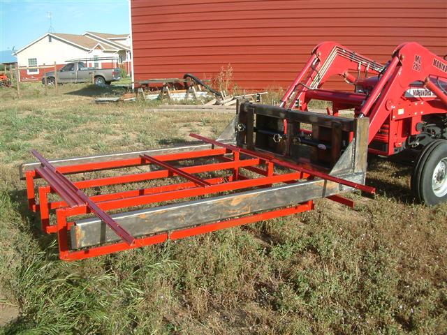 I built this combination accumulator and bale squeeze about 8 years ago for use with my 2008 Mahindra 5525. The 8-bale accumulator is clamped onto the forks of the bale squeeze and is then removed to use the squeeze to stack the 8-bale groups. It attaches to the skid steer quick attach on the 5525 FEL arms. It's a nice welding project.