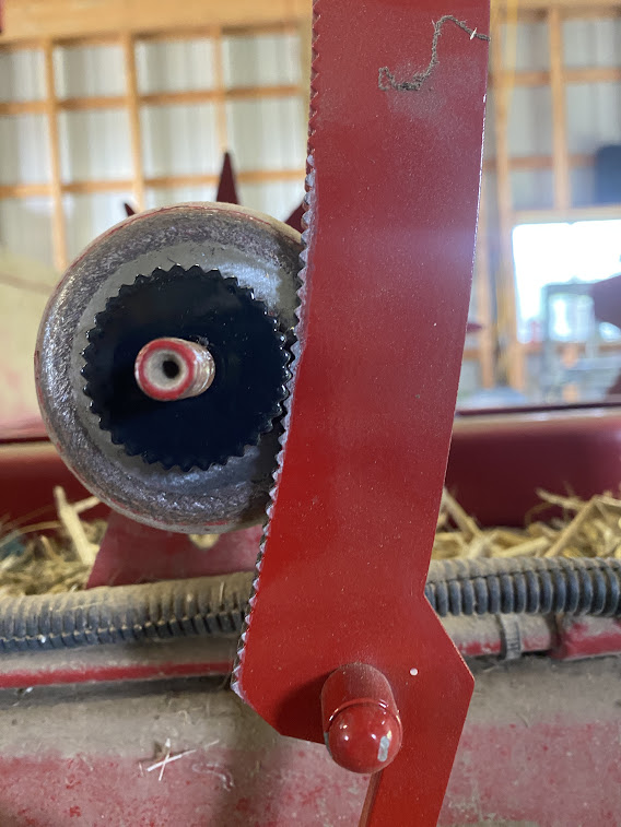 NH makes the serrated wheel harder than the arm, concequently, the teeth on the actuator arm wear out and round off when causes the bailer to trip erratically. You have my physical address so you can contact me and I can remachine your old one with new teeth if you want, In fact I need to look but I may have a remachineable one in the shop somwehere. What I did with mine to insure uniform bales is I took a small block of die plate and slotted it and drilled and tapped it for a thumbscrew so I could attach it to the trip arm to provide additional weight so the trip arm was prevented from bouncing as the bale grew in the bale chamber and you could adust the weight for optimum bailing. If you want one, let me know, only take a minute to slot a piece of die plate and thread it for a thumbscrew. Once I got it 'dailed' in my bales were all uniform length.