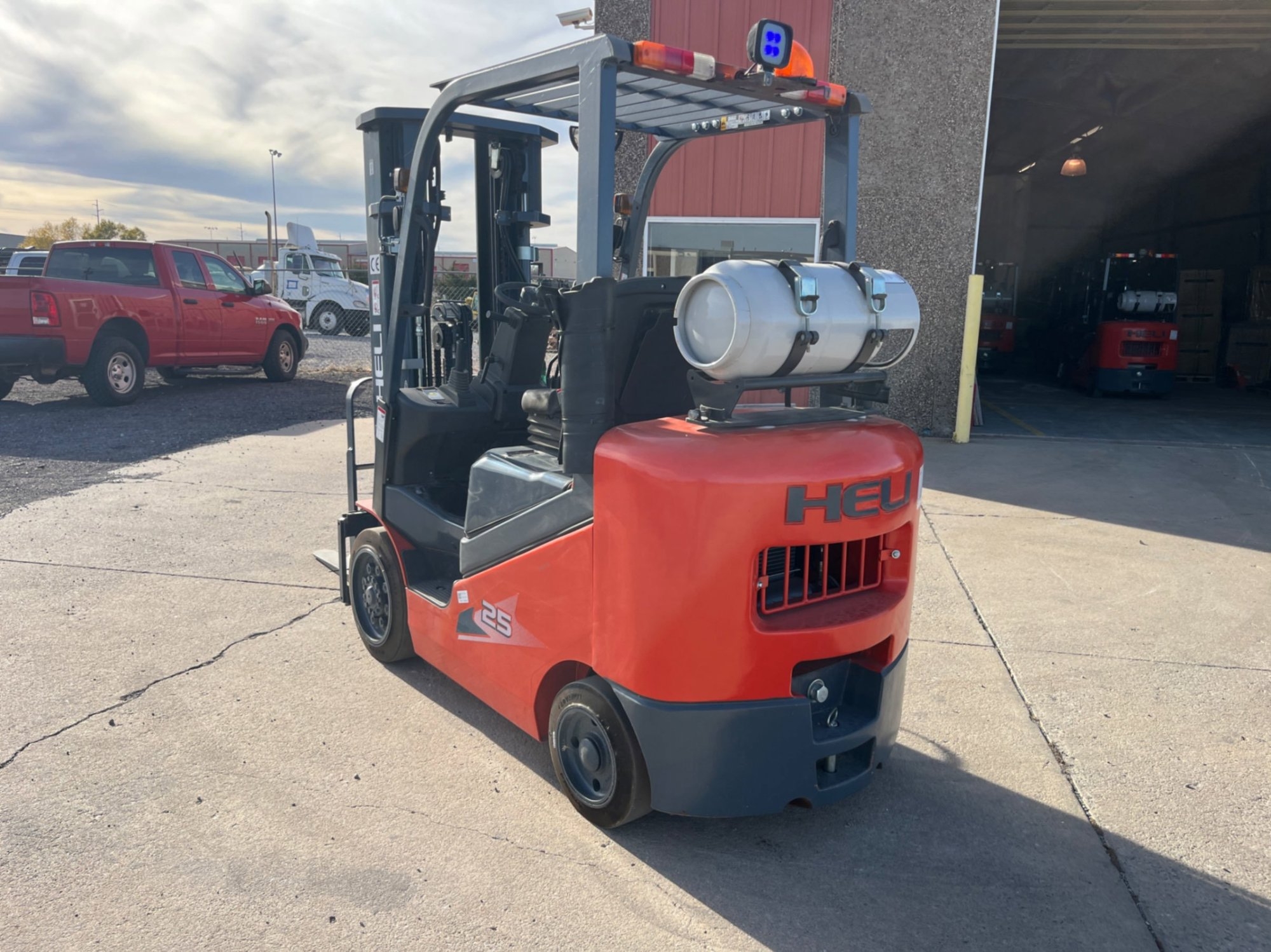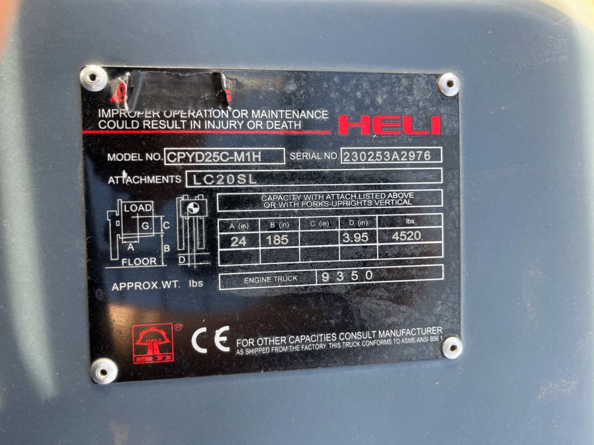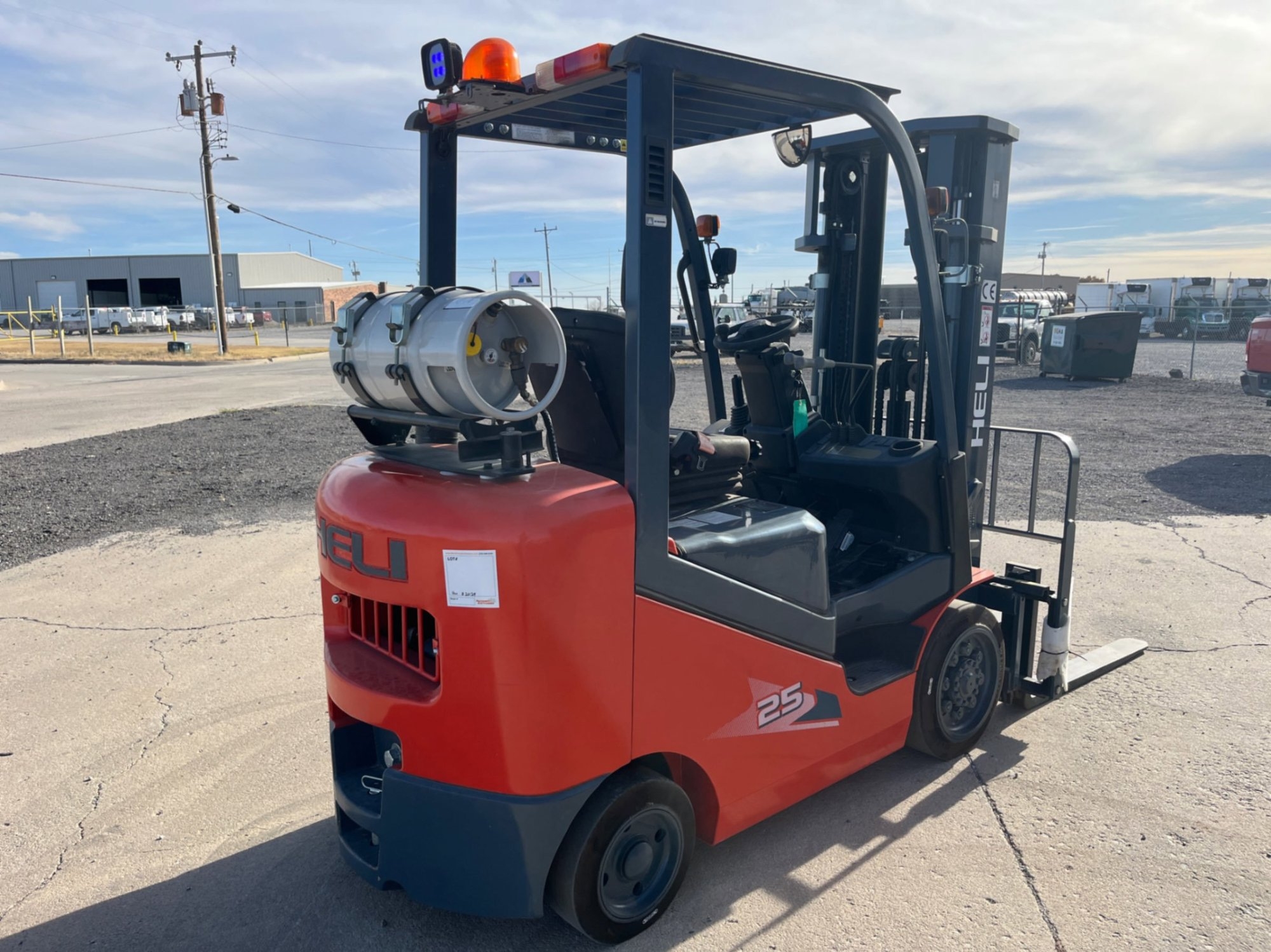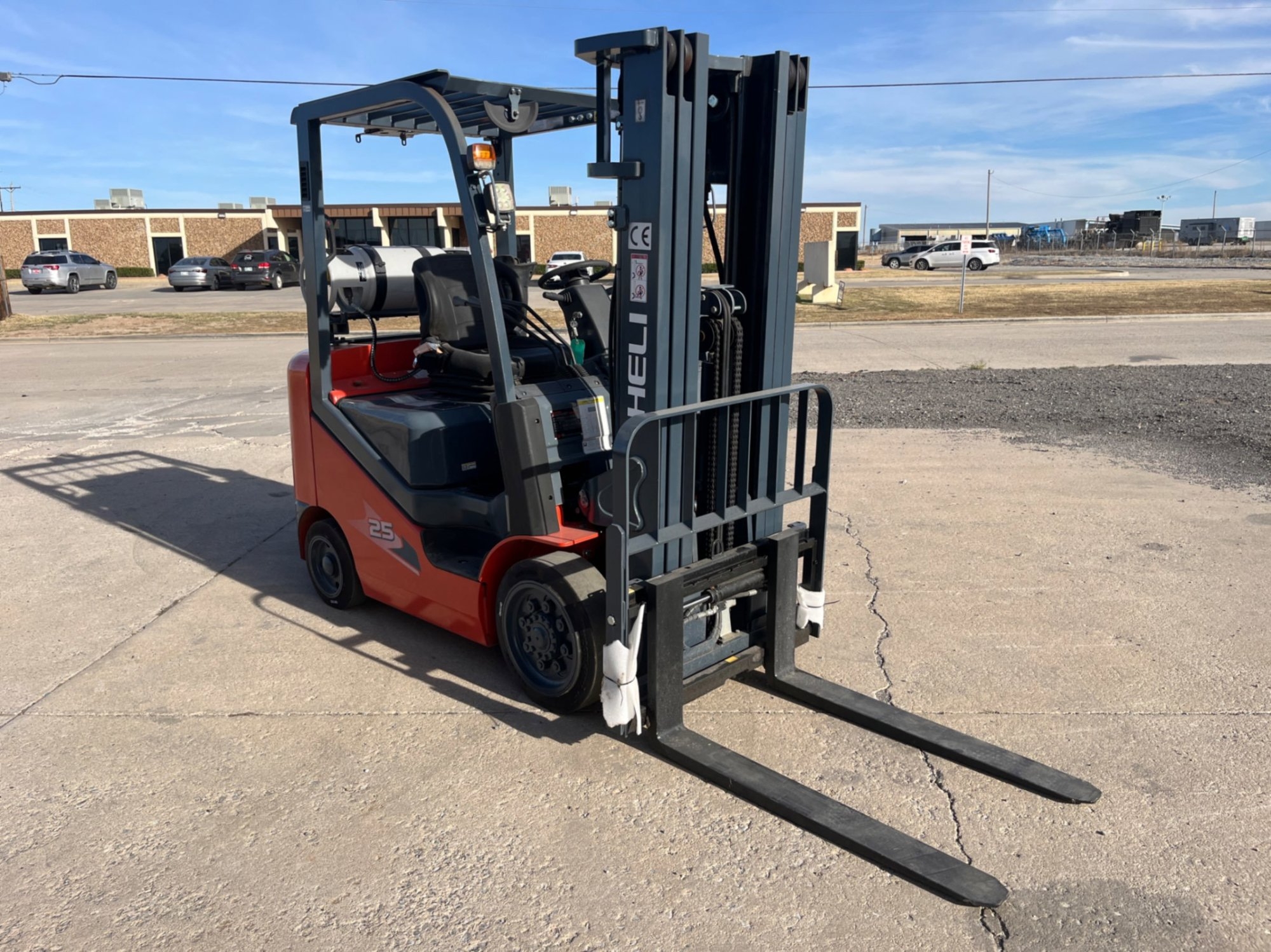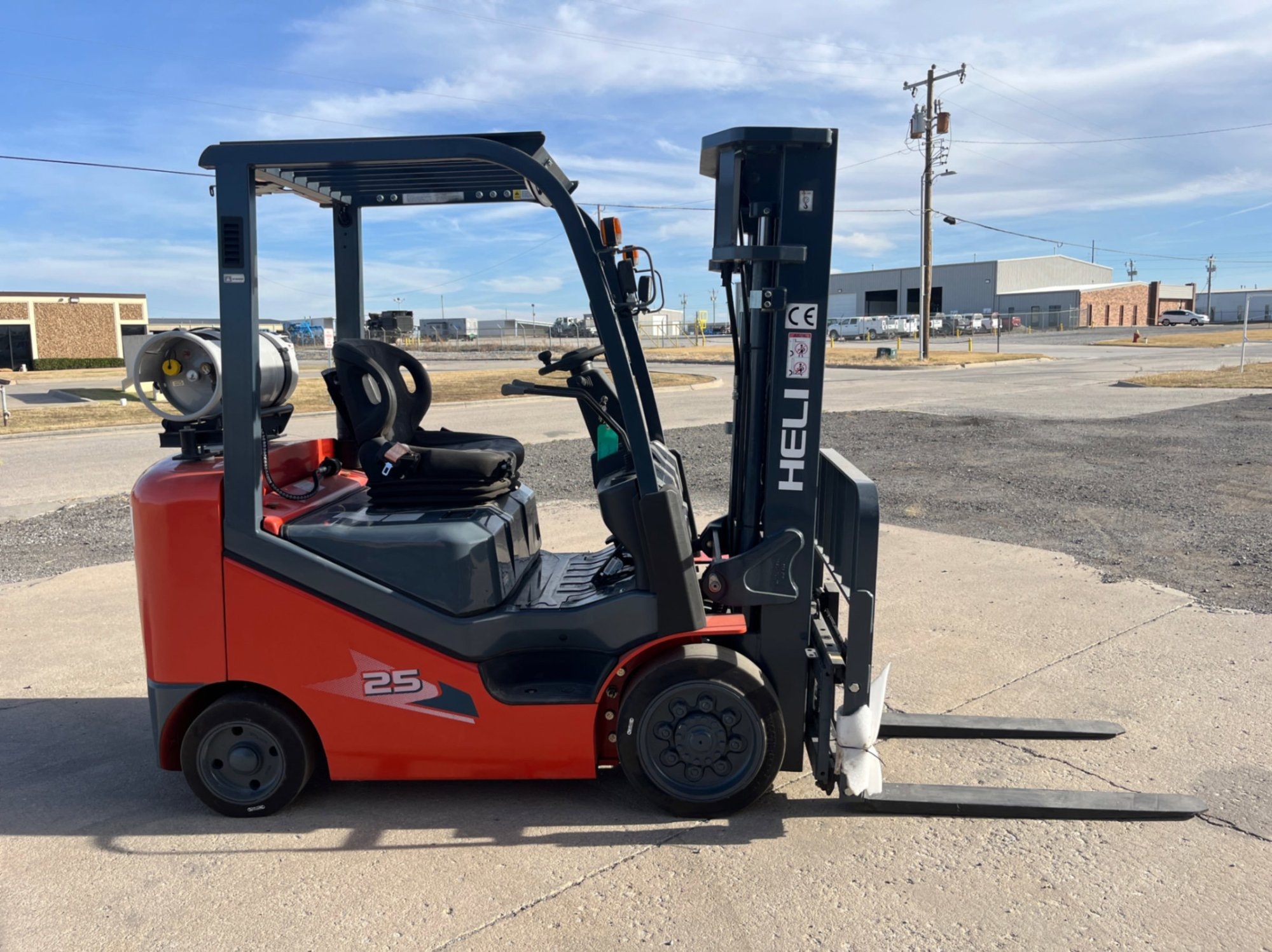 (El Reno. OK) HELI 5K FORKLIFT VIN/SN: 230253A2976, METER READS 2.7 HOURS, ENGINE STARTS:YES, 48 FORKS, CUSHION-TIRE 4-WHEEL LPG FORKLIFT, 5,000 LB CAPACITY, TRIPLEX MAST WITH 185 IN LIFT HEIGHT, SIDESHIFTER, HYDRAULIC POWER STEERING, COMPACT WIDTH FOR TIGHT SPACES. ITEM# 20129