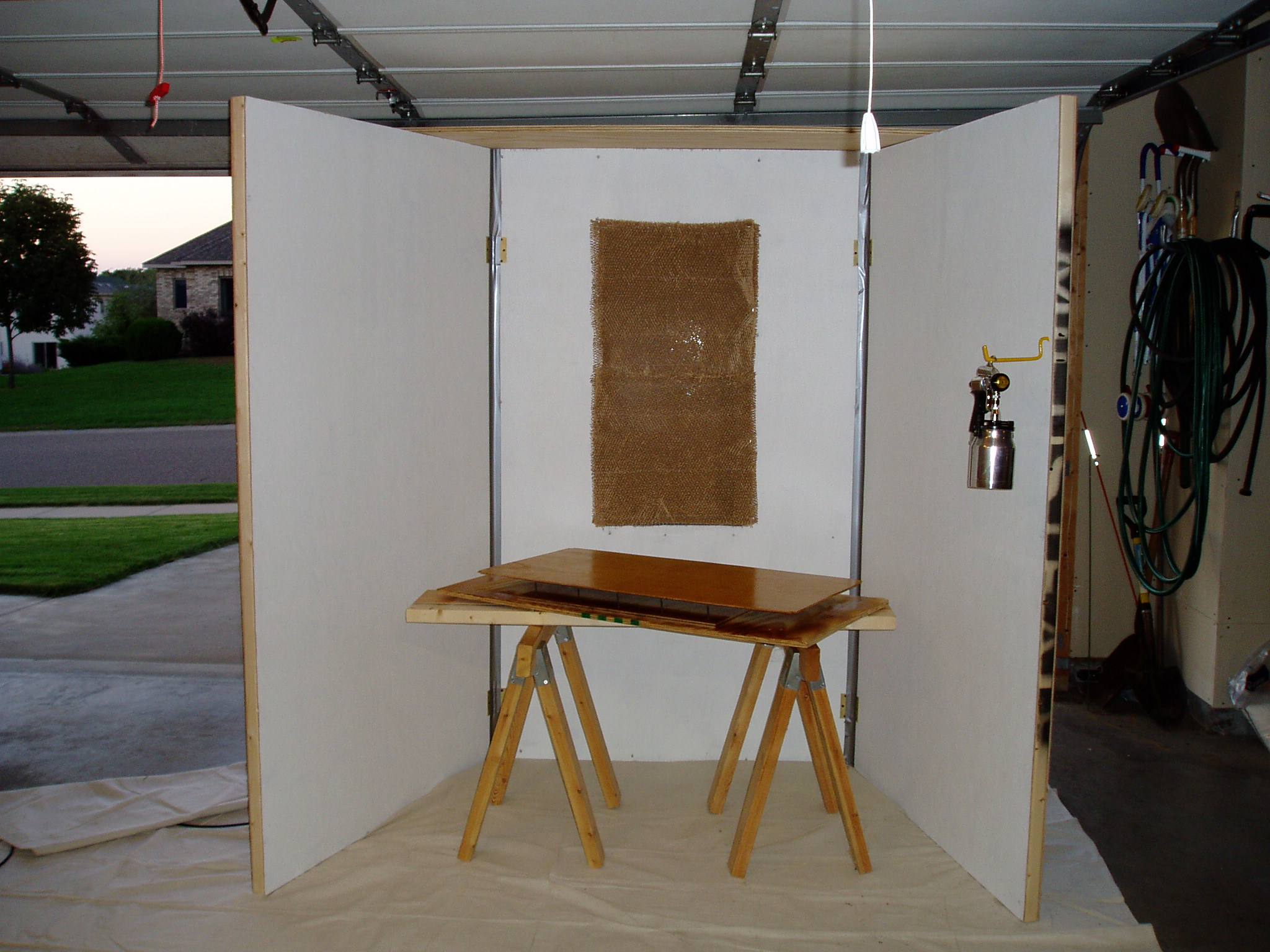 and just put a long flex cord on it, so I could plug it in well away from the booth. I would take the fan off when I broke it down. I also made a lid for it out of 1/2-5/8" cheap plywood with a cutout to lay a 4' fluorescent light on top for extra lighting (first pic). I screwed in a clear plastic piece to the plywood to help seal the light away from any fumes. I also made a turntable from a lazy susan from HD which is helpful as others have pointed out (sitting on the horses, though not obvious). Once I had it set up, I would put 2" cheap masking tape over the hinge seams to direct airflow better and help keep bugs and stuff out was about all I had to do before starting. Oh yeah - I also put down a heavy canvas painters tarp before setting it up. Mounted a screw-in hook for the spray gun to hang it when I needed to. Just unscrew it when breaking it down. I bought a box of spray booth paper filters and stapled a few up over the opening to the fan. Never had to change them the few years I used this (sporadically).