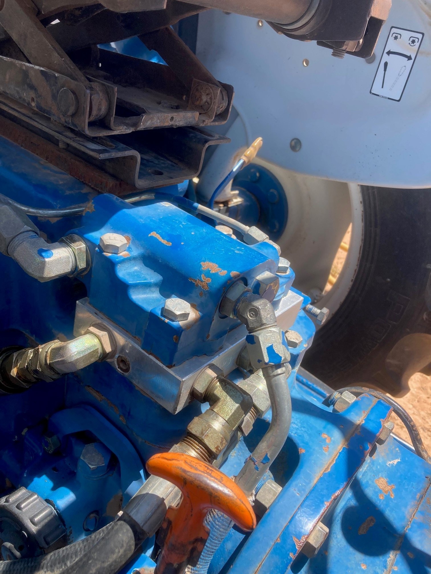 New to me used tractor. In order to change the air filters, the aftermarket end loader has to be removed. Doing this last week, as soon as the three hoses connected to the loader mounted joystick were removed, the hydraulic pump loaded up and sounded exactly like I was operating an SCV valve lever with no implement connected to the rear remote. This tells me that the relief valve is located in the joystick. While I don't understand much about it yet, I have determined that the joystick is a power beyond model. I'm concerned that using the tractor even for the couple of minutes that it takes to back it away from the end loader and then driving back into the end loader will damage the hydraulic pump. An aftermarket block was added to the hydraulic system to obtain the additional ports needed to power the end loader hydraulics. The manner that it was done puts the return quick connector in a position that makes it just about impossible for me to connect one of the pressure hoses to the return quick connector. I can't even test the idea if I can't get the hose connected. I have no idea who manufactured the block, so I can't research how it is ported in order to figure out a solution.