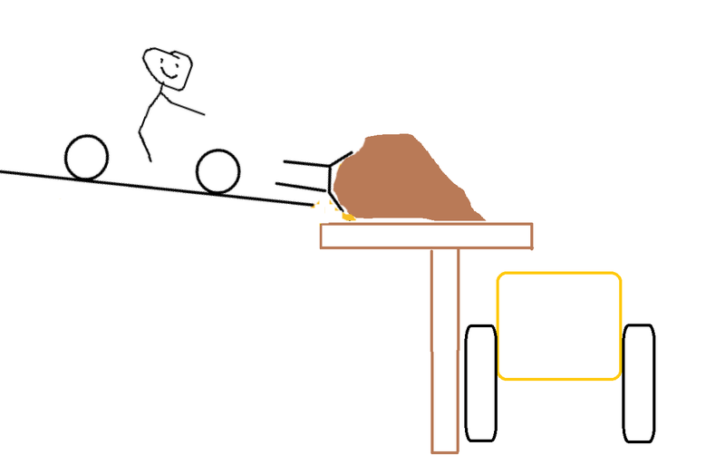 You dig a trench wide and deep enough for the trailer next to the pile and shore it up well. Build your material ramp so it hangs out a foot over the edge of the trailer so that the material always falls off the ramp into the trailer instead of onto the edge of the trailer, or you'll be scooping out the trailer trench periodically and/or the trailer tires will ride up over the spills a bit higher each time until you have to clean out the trench. You don't have to make the loading ramp as downhill as exaggerated in the drawings. Level would be fine. But uphill will cause a lot more work to be done VS level or downhill. When loading, gravity is your best friend.