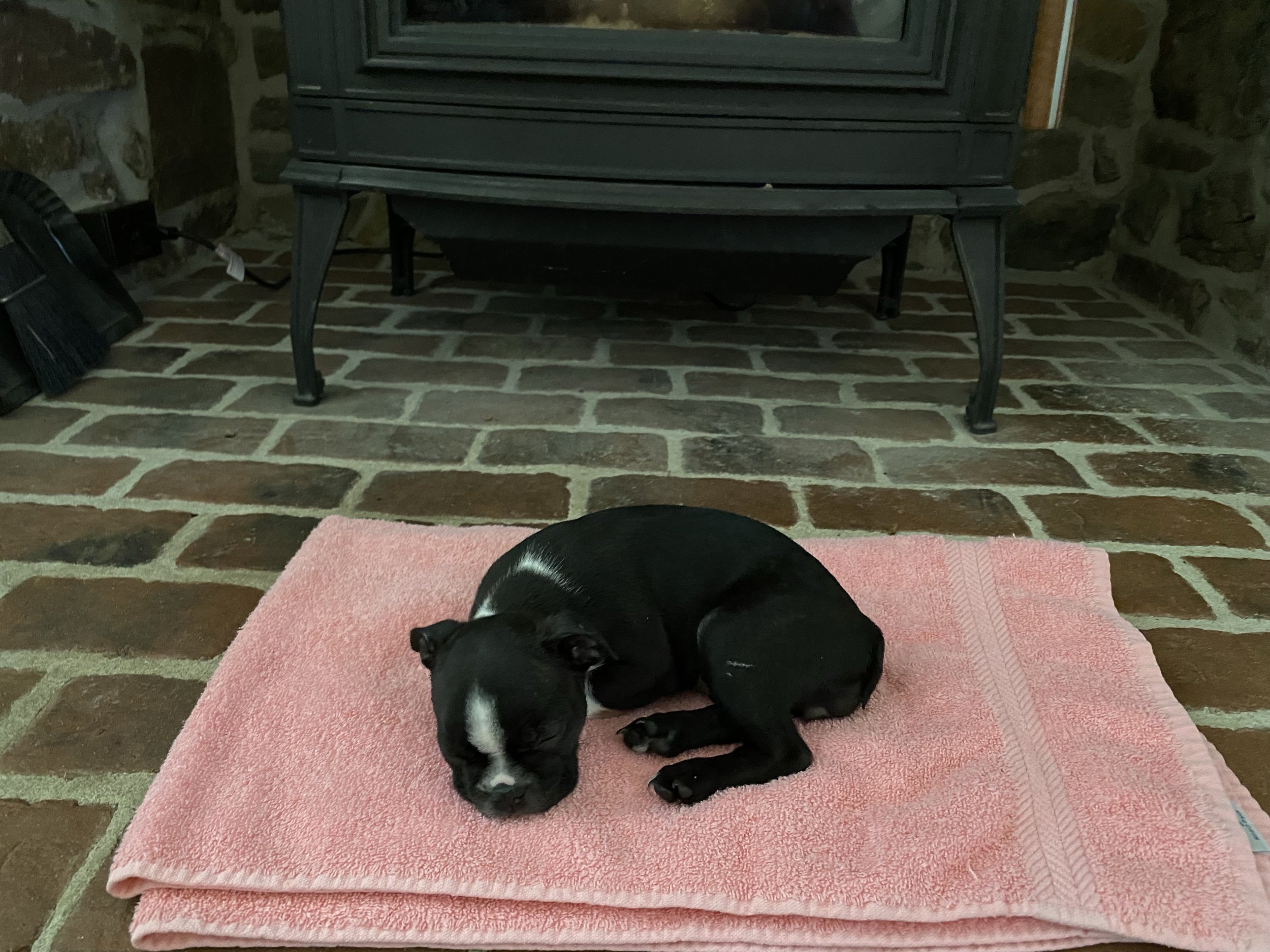 My wife will spend the first few evenings on the couch, with this one in a crate on the floor near her, in case it needs attention or the potty in the middle of the night. Once she gets more comfortable with us and the house, she'll be overnighting in her crate in the mudroom, until we get past the puppy phase. If she's like the last two, she'll spend days in my office, either snoozing in front of that stove or by my feet under the desk. We both work from home, so she'll get plenty of all-day attention.
