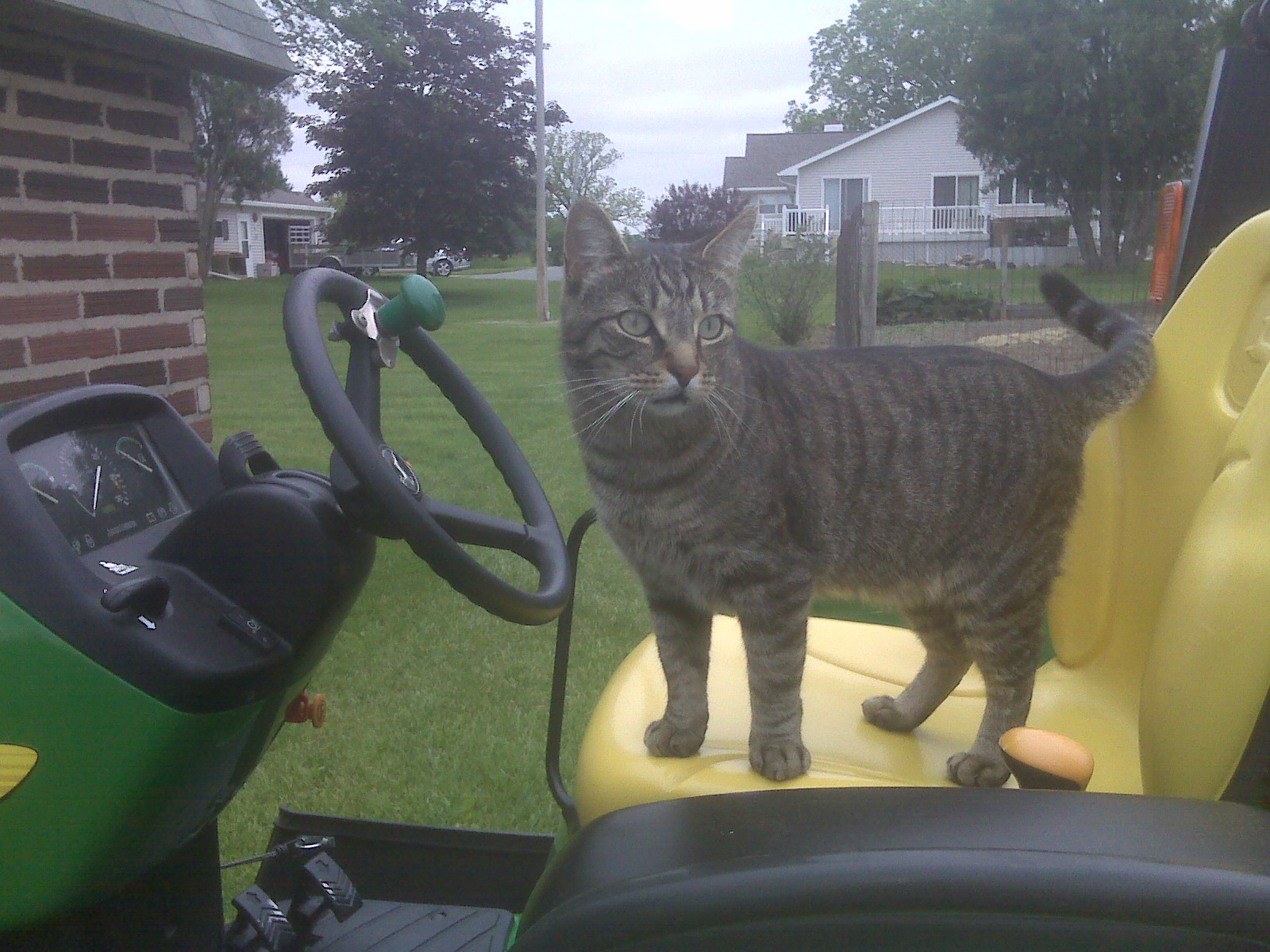 I had a cat that would ride on my four wheeler with me. I got him used to sitting on it with the engine running and then riding around the yard slowly. He got to where he would jump up on the seat and wait for me to take him riding. He was about 14 years old and deaf so the engine noise didn't bother him. Unfortunately he was run over a few weeks ago(never heard the car coming).