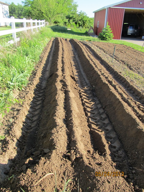 Just a quick update. I used my hiller yesterday. I set the discs at the same width as the rear tires, angled them in and drove backward down the rows -- this moves the nicely tilled dirt before I run it over with the tires. I adjusted the hillers inward a few inches each and ran down the rows a second time. The 2nd run didn't do a lot, but it did build the hills a little higher and reduced the trough down the middle. Anyway, I'm very pleased with the result -- see pic. :thumbsup: IMG_3184_1.JPG