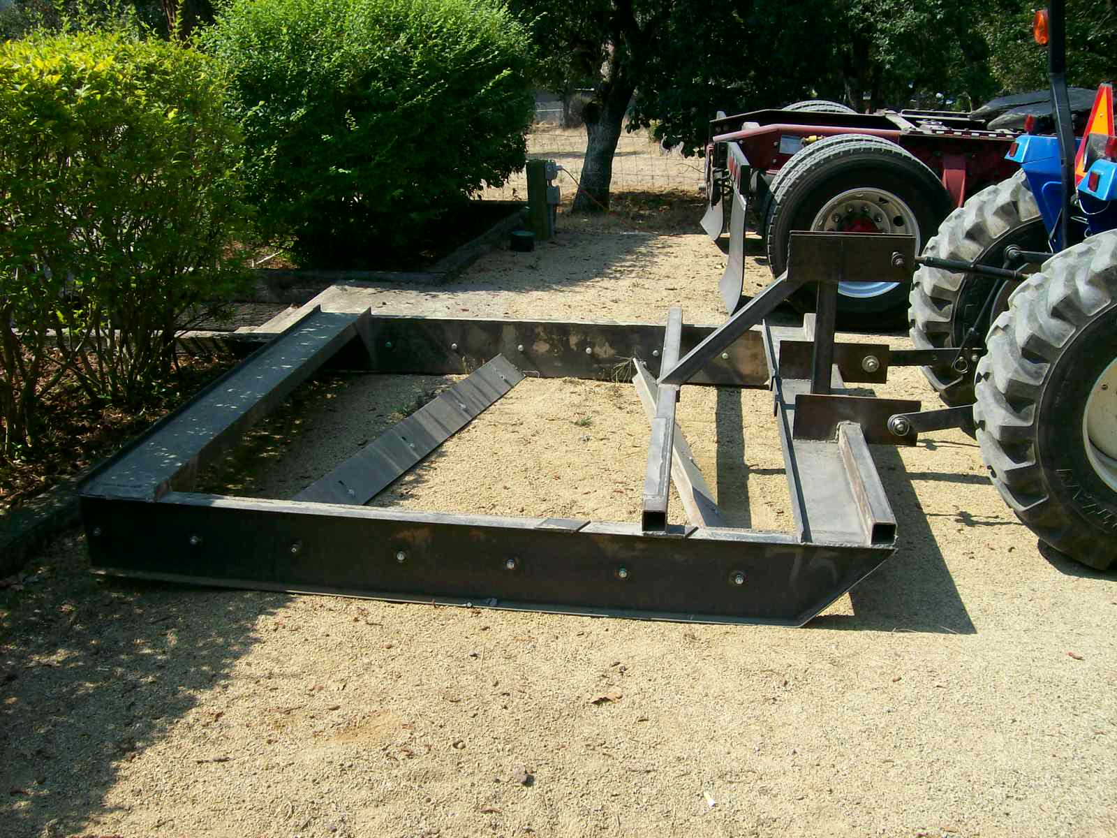 Land plane / road grader I built a couple of years ago . Added some additional bracing , modified the blade adjustment since these pictures were taken , but still no paint .