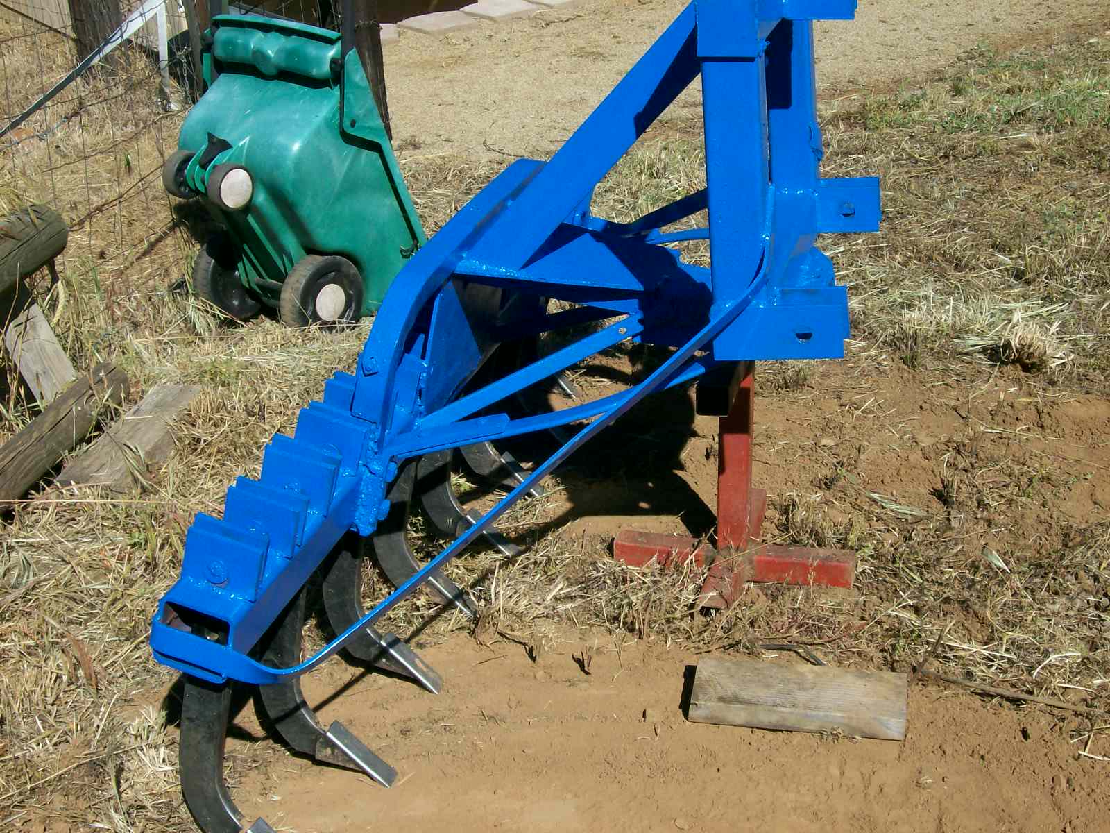 A 8 shank ripper that I made from a old single gang disk frame . What started out life as a 2 gang pull disk was converted to a single gang 3 point disk , then everything that was from the axle mounts on ward was cut off , braced , and the 4" x 4" x .25" tubing with shanks was added . Can pull it side hill or downhill with my TC30 , but uphill get's a little iffy when I try to go to maximum depth .