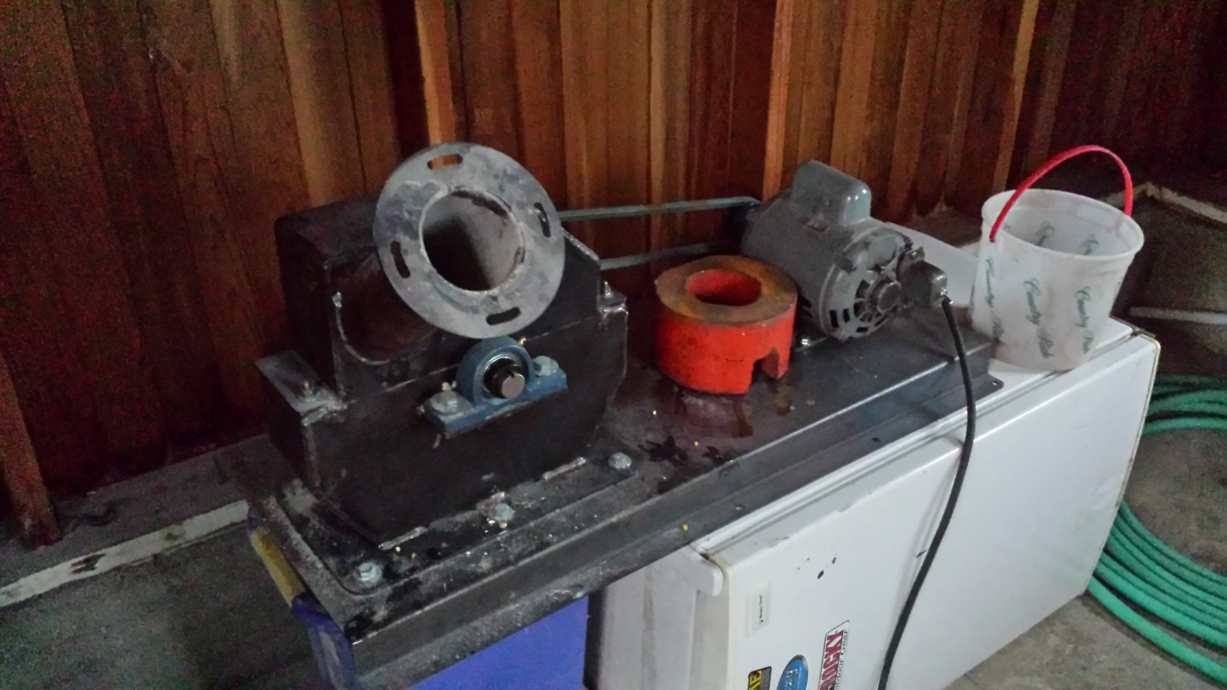 Here is a picture of the little contraption, its not a very good picture, but it shows the overall size and what I have done so far. The motor is a 3/4 HP 120v that I borrowed off our hay elevator. The Blue tub is there to catch the ground feed.