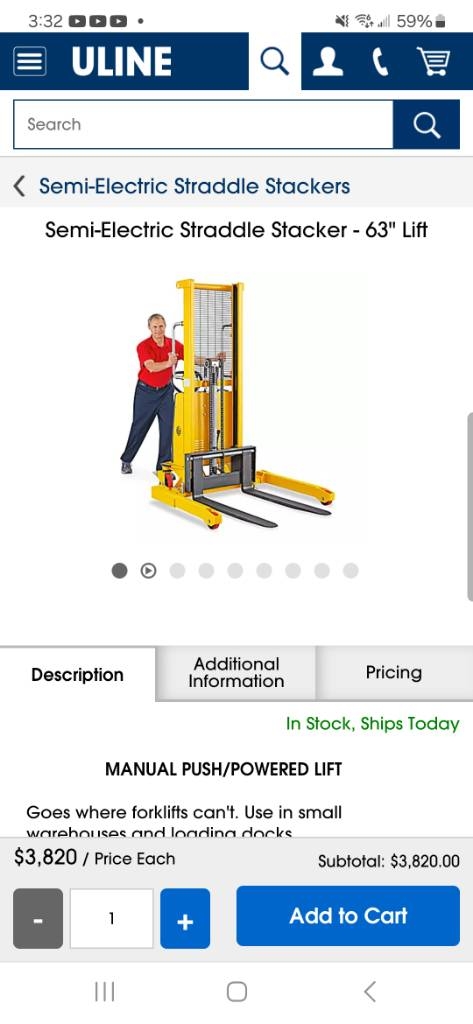 Not that specific model, but there are kinda half way between machines; that can lift like 48", if that will stack what you need. I do think they are more money than you want to spend.I've looked at these also, but it won't lift high enough to stack indoors. I'm still stuck between the forklift vs skidsteer with a seven foot garage door.