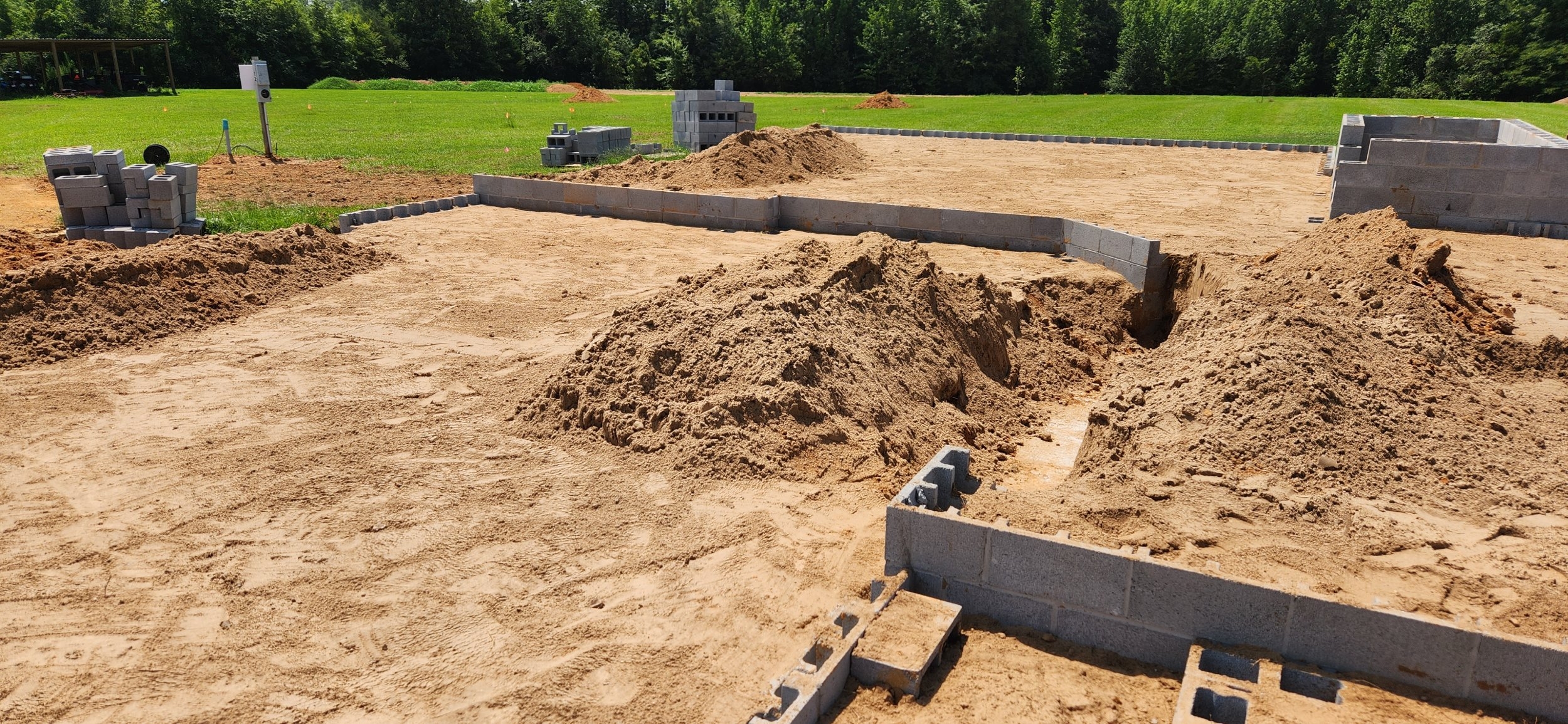 This is the real reason I was a little miffed about paying someone to grade the foundation... It was a wasted effort. The plumbers left it as bad as if it was never leveled in the first place! The first thing they did was dig a bunch out of the garage area to pile on top of the blocks to get their mini x on top. Then dug another big area out for material to pile onto another set of blocks to get it into the house.