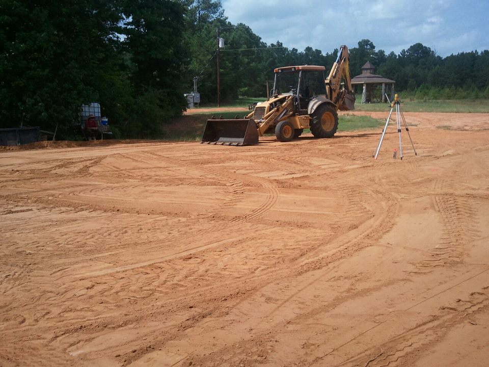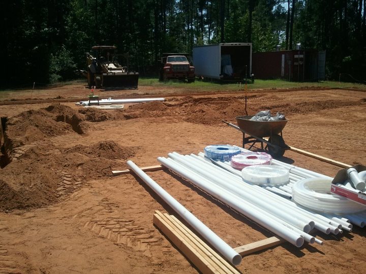 We had to add about 50 yards of dirt to build up the pad. My dad did all that with the backhoe, one yard at a time. I spread and leveled it off, then measured it out and put in the forms. Then I measured and marked the locations of all the drain lines, the water main and the water lines to the island in the kitchen. Dad and I both dug the trenches, but he did the hard part by digging around the other lines going to their RV to get to the sewer and water lines.