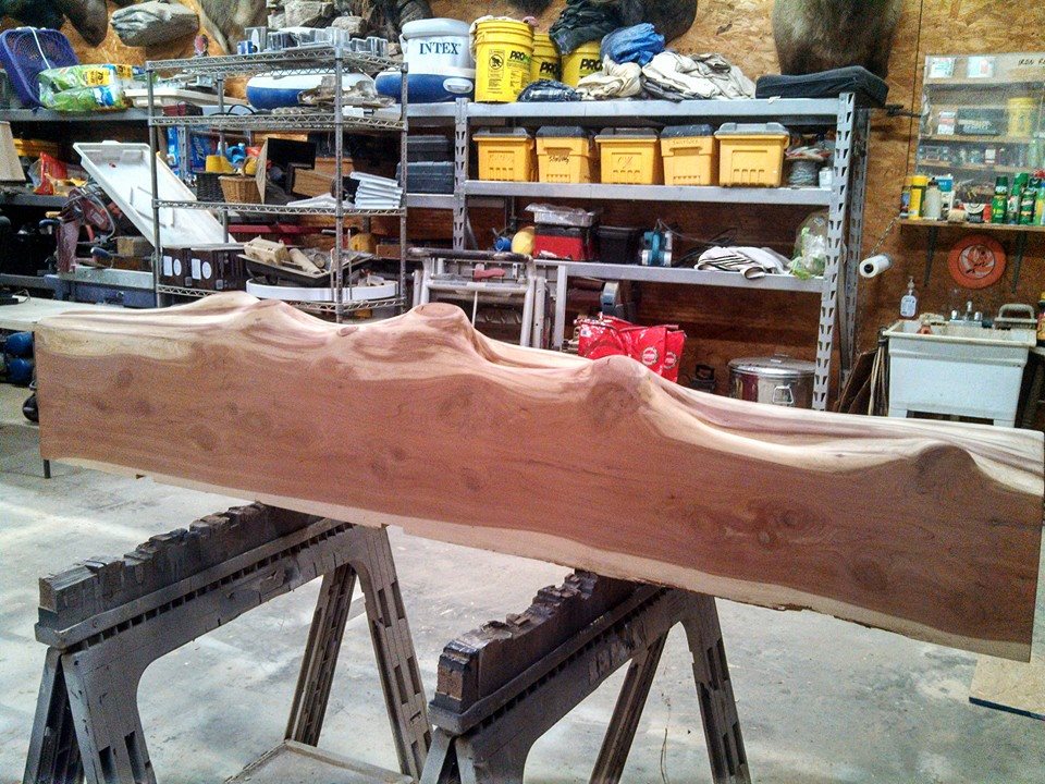 As for the mantel, I've decided to go with 3 heavy duty metal brackets that I'm lagging into the back of the mantel and then into the wall. I notched the back of the log last night after I finished sanding it. I also stained it after I took this picture and will start putting on the layers of finish coat as soon as it's warm enough.