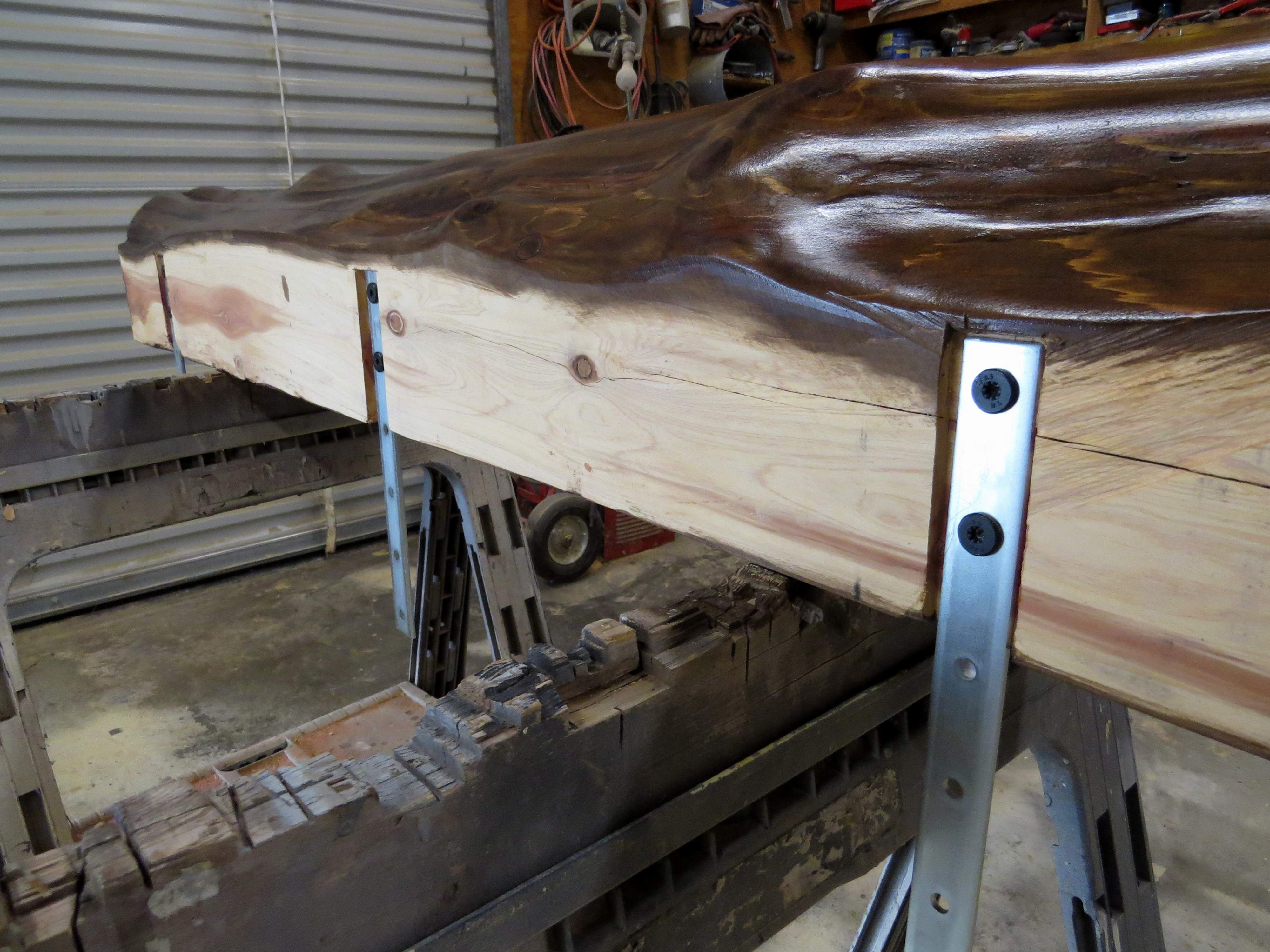 I finished off the mantel with four clear coats of Minwax clear satin Plycrylic. I decided to go with lag bolts and metal brackets to hang the mantel. I had installed a header made from 2x8's and half inch plywood when framing the house, so I would have enough strength for whatever I decided to use for the mantel. I used 4 1/2 inch lags into the mantel and 3 1/2 inch lags into the header. It weighs somewhere around 100 pounds.