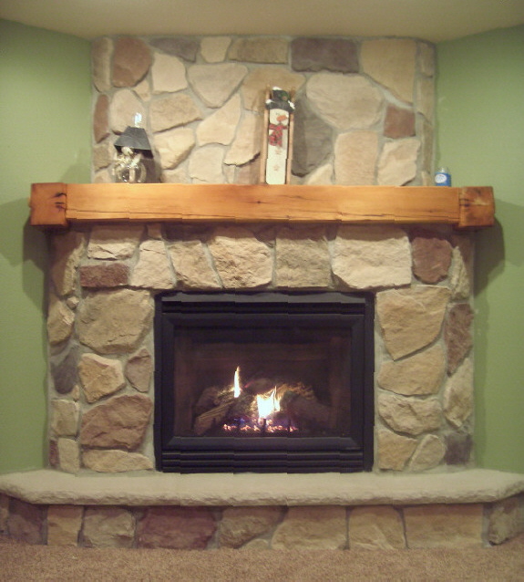I finished off the mantel with four clear coats of Minwax clear satin Plycrylic. I decided to go with lag bolts and metal brackets to hang the mantel. I had installed a header made from 2x8's and half inch plywood when framing the house, so I would have enough strength for whatever I decided to use for the mantel. I used 4 1/2 inch lags into the mantel and 3 1/2 inch lags into the header. It weighs somewhere around 100 pounds.