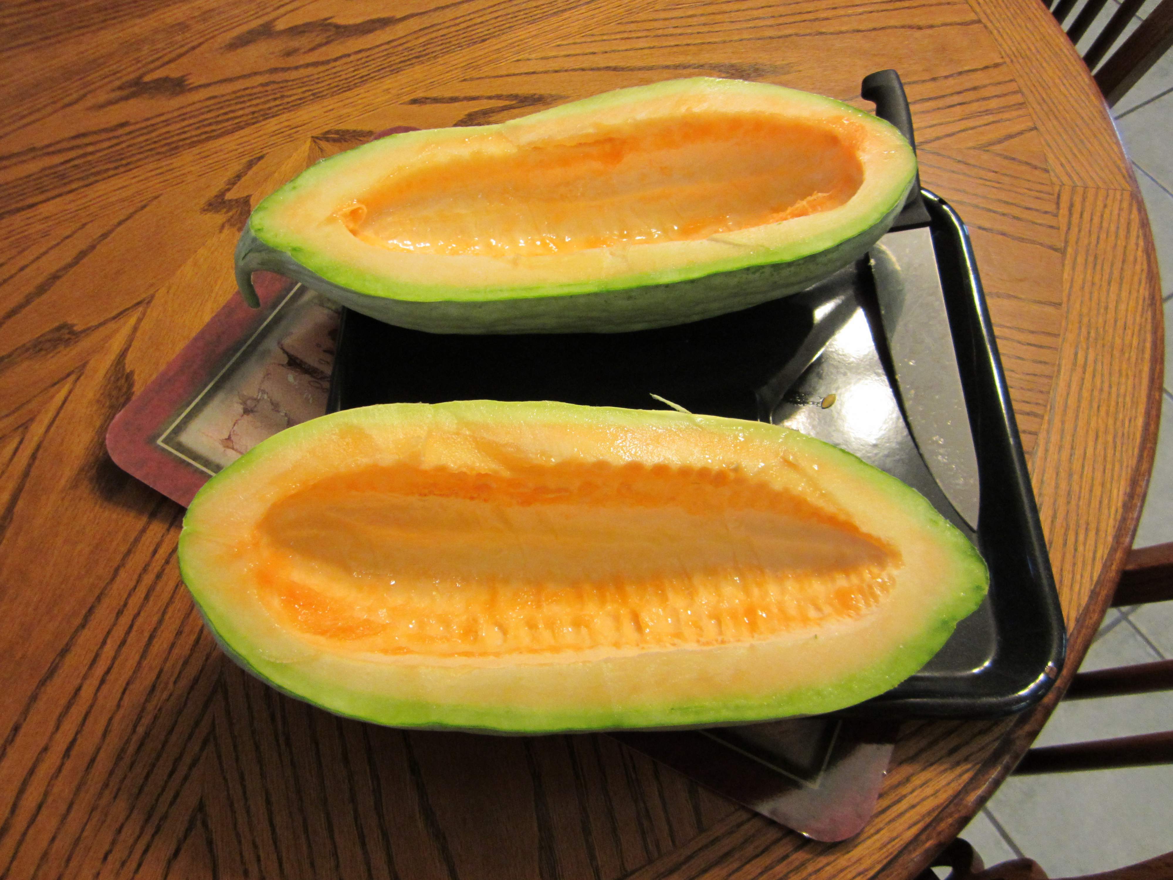 1. The whole garden. 2. Banana cantaloupe, long green good and icebox. 3. Some people do square foot gardening. It's so crowded in my garden, it's cubic foot gardening. This melon is growing on the fence. 4. Yesterday's peppers. 5. Banana cantaloupe.