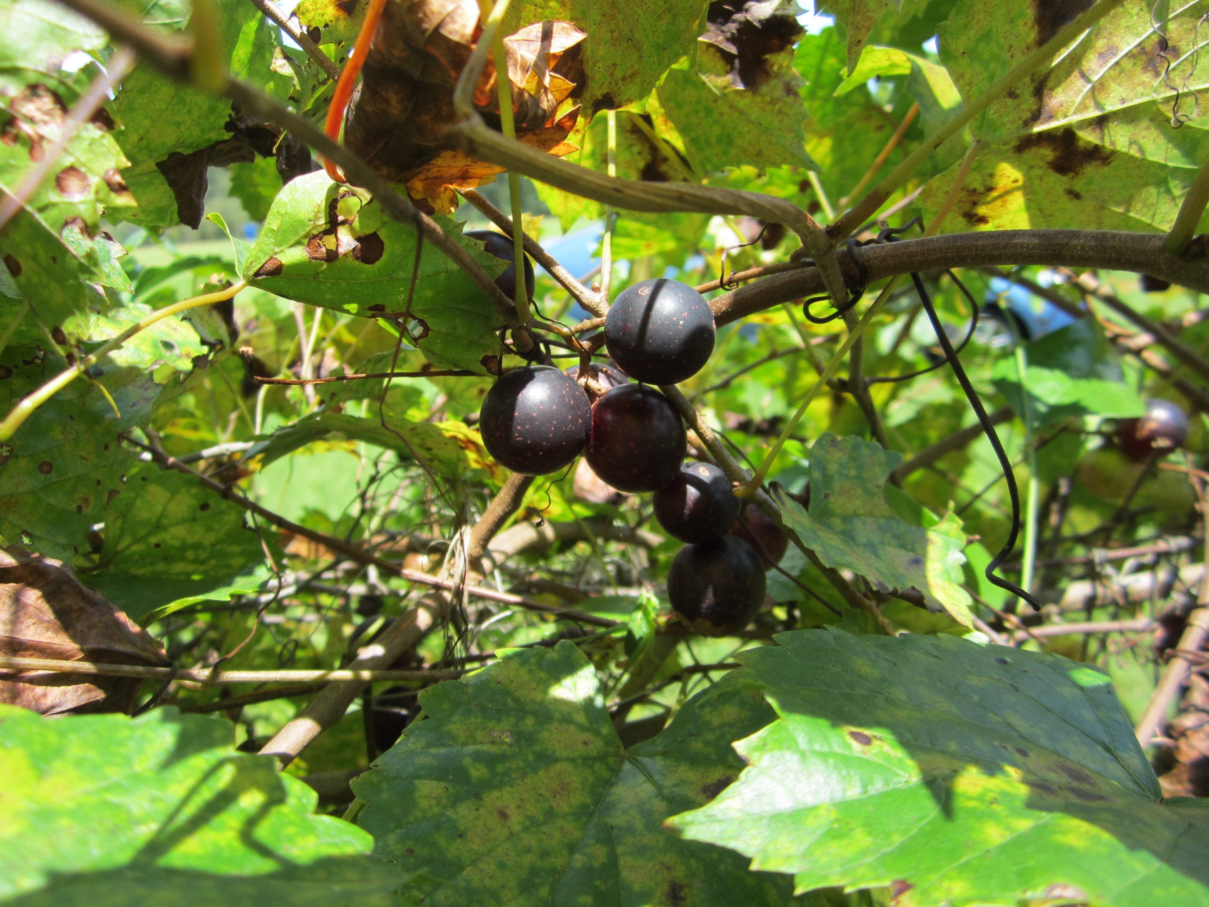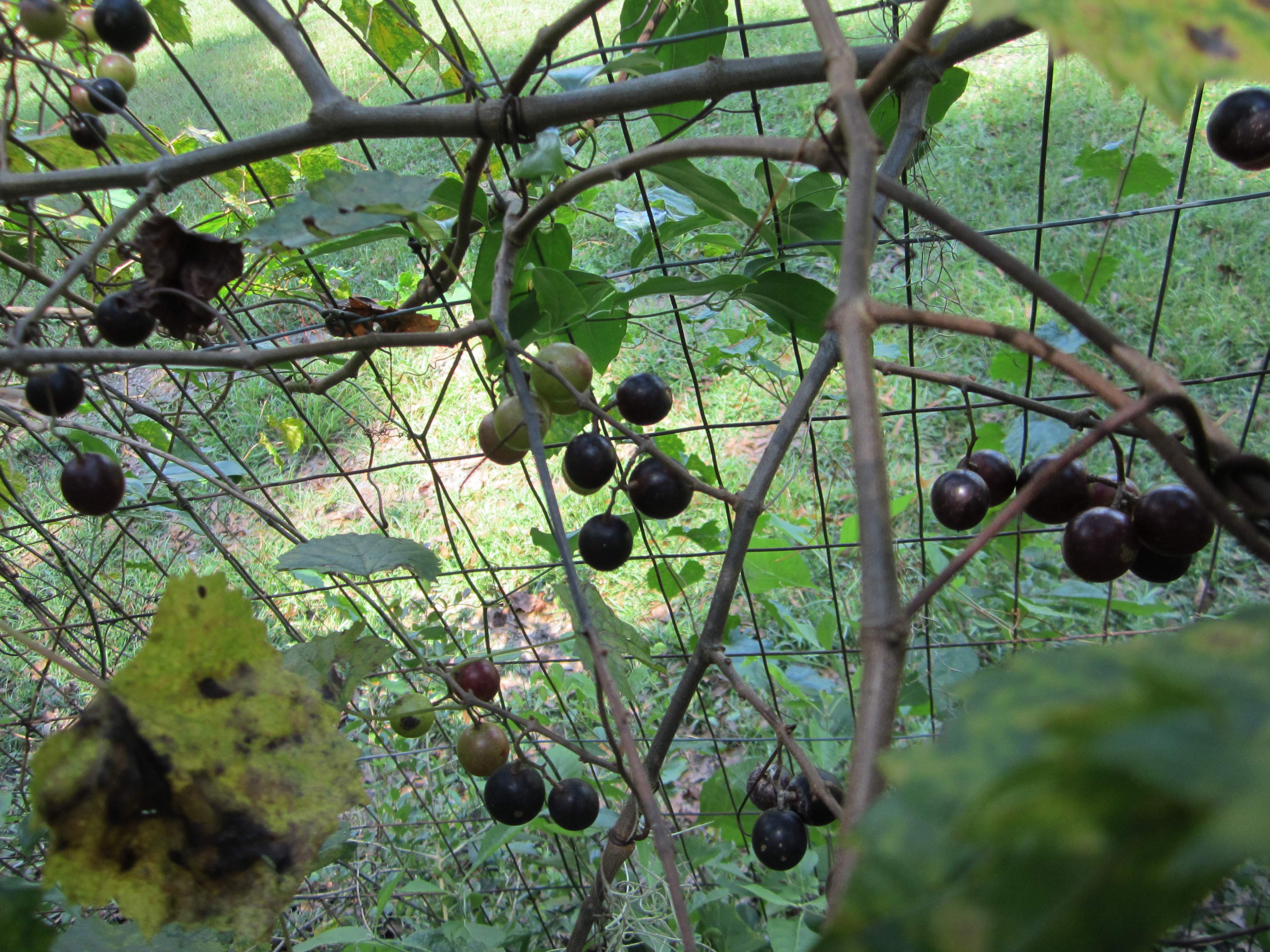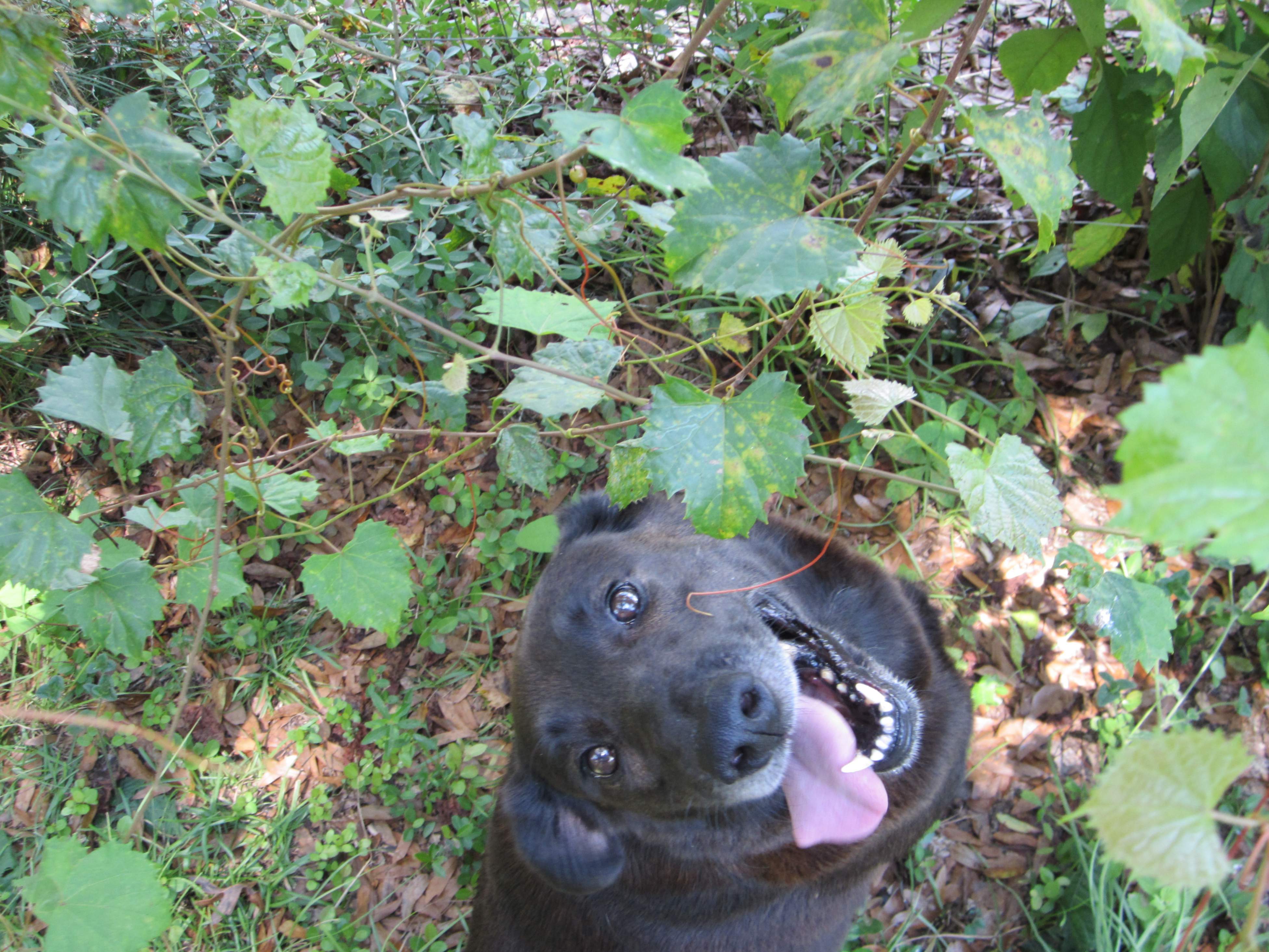 We have let a wild grapevine grow up on the dog fence. This is the first year we have picked more than one or two grapes off it. I ate my fill today, and had a double handful to bring in the house. So far Mocha hasn't learned to pick them for herself, but if you drop one, she knows how to eat them.