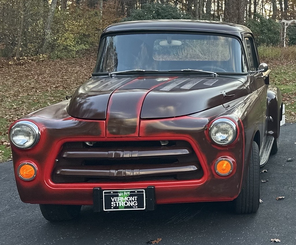 The truck is the way we bought it (including the louvers), primer, partially sanded back over the earlier red paint. I did a wipe-on clear to keep the primer from rusting. After two years we're still unsure if we're going to paint it. Probably not.