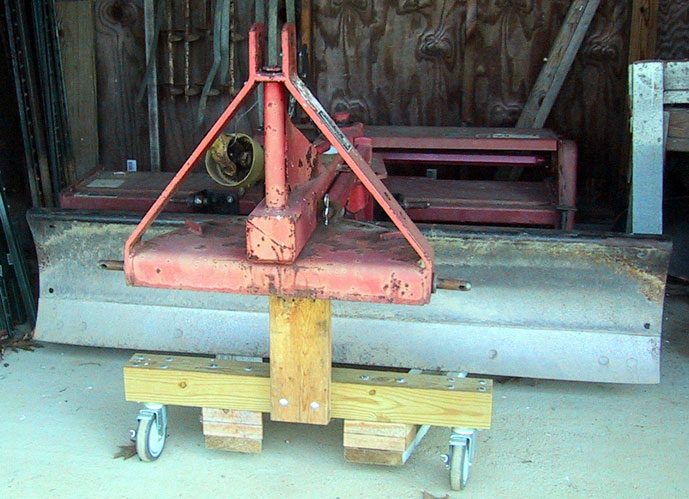 I've been thinking about getting a car port style structure and parking the tractor and implements under it. If we had 2 3-point-hitch implements, it seems that we could park the tractor and implements under the car port with 1 implement facing the same direction as the tractor (just back through the front opening to hook it up) and the other implement facing the opposite direction as the tractor (just back through the rear opening to hook it up). But if we had 3 implements, it would be a bit trickier. Would it make sense to stack them? I can imagine building a shelf out of 4x6 or 6x6 beams supported by concrete blocks and placing the rear blade on top of it. How high can a 3-point-hitch reach? Would we need to sit the implement on top of the shelf on something that can be moved with pallet forks?