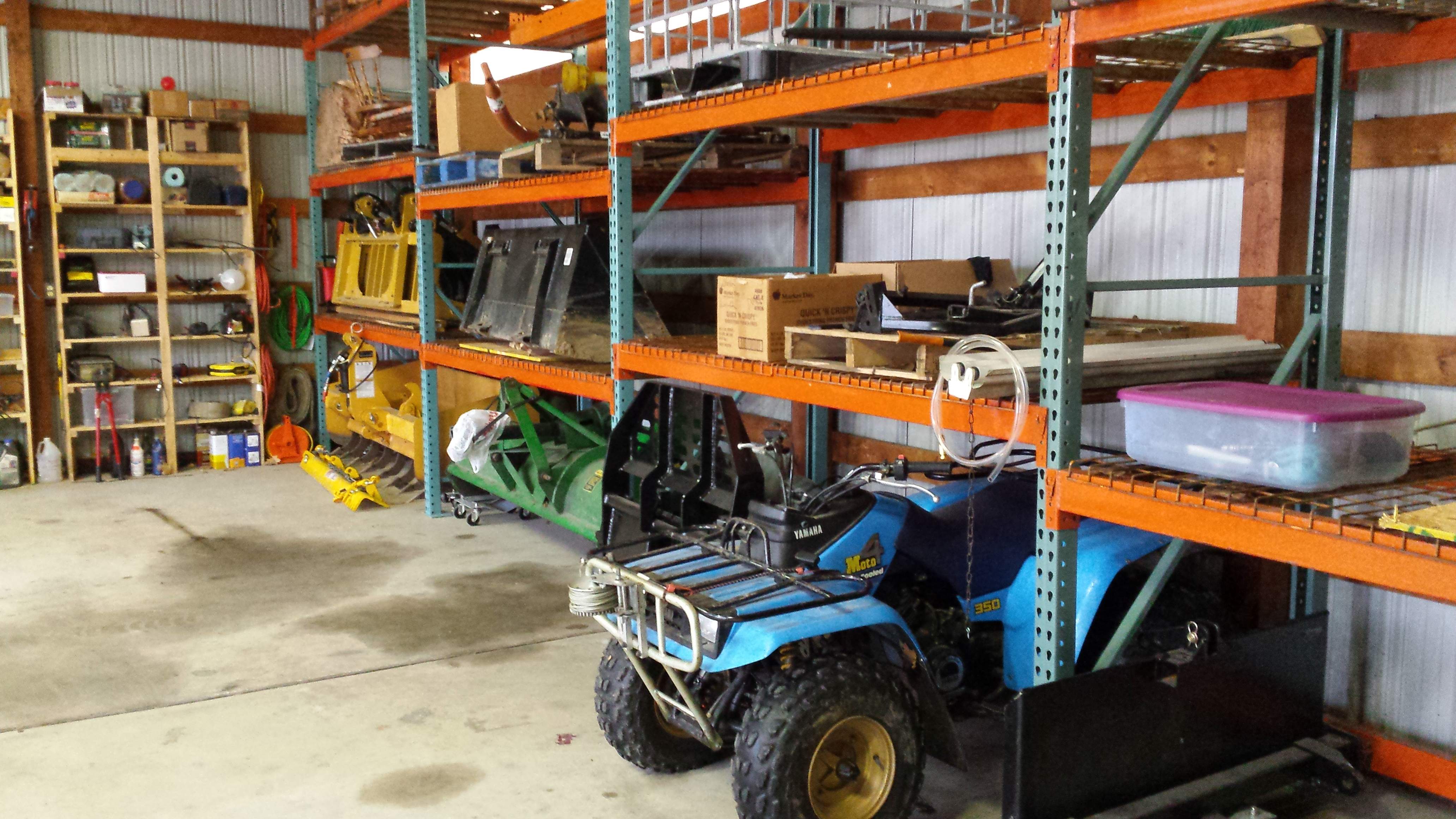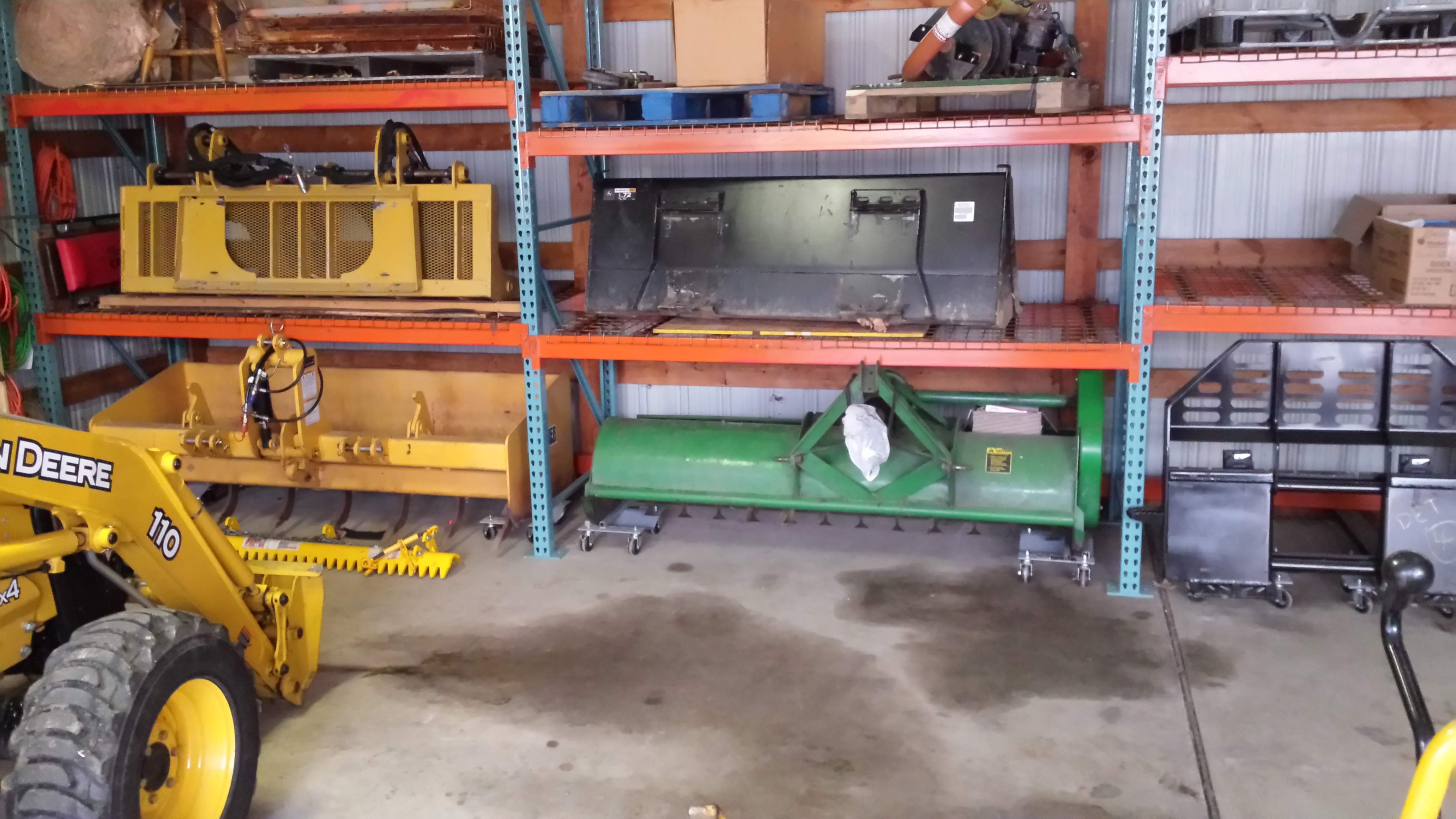 My attachments are stored inside a pole barn with a concrete floor and some are stored on pallet racks.