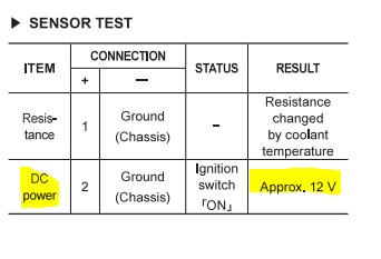 First off this chart is garbage because where is 'connection 1' and 'connection 2' on a ONE WIRE sensor? And what is status "-"? There's no 'legend' or footnote helping you understand these. But let's double down and say there IS a wire going to terminal 2 of this 1-wire sensor that has 12v on it when the ignition switch is on. Well, if you didn't already notice that there weren't no two "connections" on your 1-wire sensor, or if you assume that the omitted information would tell you (if it existed) that connection 2 is actually the WIRE you just disconnected from the sensor, that 12v thing might seem plausible. But.. if you look at the resistance specs provided for the sensor, you can see it is designed to go down to 1.2ohms: