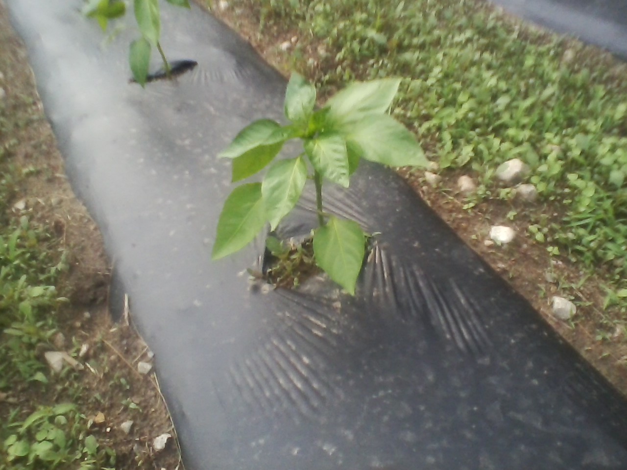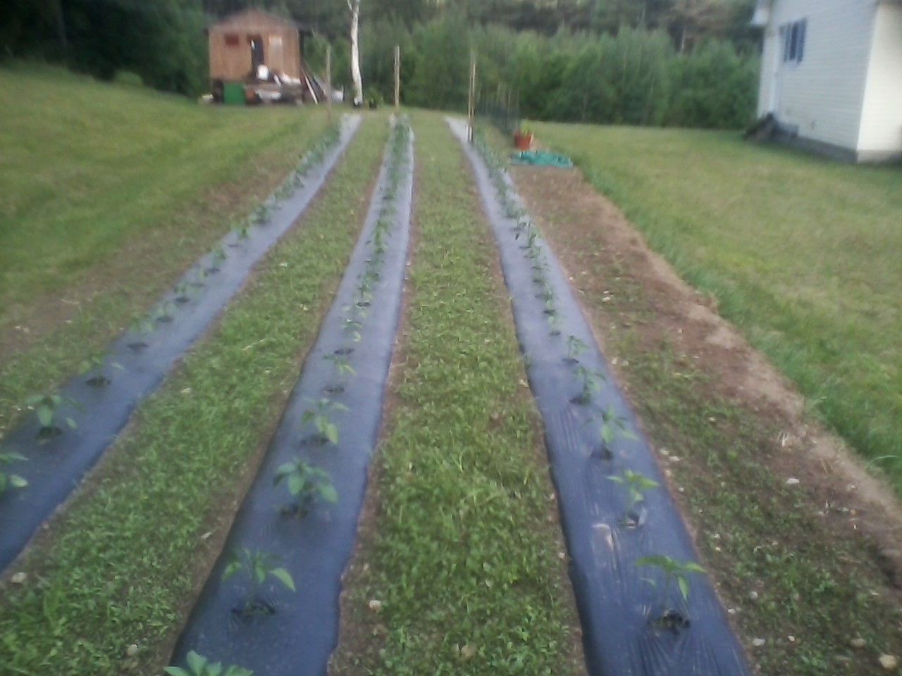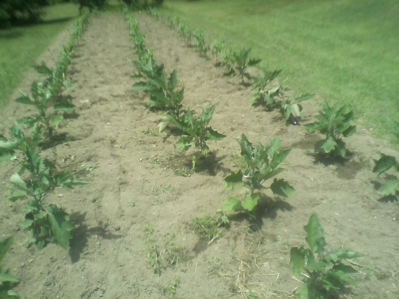 Here's a shot of the garden from last year with no plastic down really does make a differnce here. Took a lot of hand weeding to around cleanup those eggplants. Just needing to walk my Troybuilt pony tiller between the rows of plastic soon. Ideally if I had the room my rows would be wide enough to use my JD4100 and 50" BH tiller in between