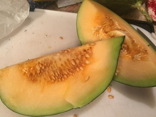 And back to the melons...we have this growing in the garden. Some sort of cross-pollinated melon I suppose? Looks kind of like a small young watermelon, but is ripe, and upon cutting it open it is quite clearly a cantaloupe. But it doesn't look like a cantaloupe on the outside, and seems to have a hint of cucumber flavor. What we have here might just be a cantawatecumber. At any rate, it is clearly a genetically modified organism of some sort. As such, I think it is supposed to be bad. But we're gonna eat it anyway.