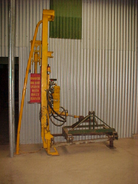 Monroe Hydraulic post auger and knocker, the auger motor swings in under the dolly for when a pilot hole is required, I have about 4 auger sizes to fit, usually choose one a bit smaller than the post so the post will be driven in and be tight. Only require a pilot hole for 5" + posts or in very heavy soil.