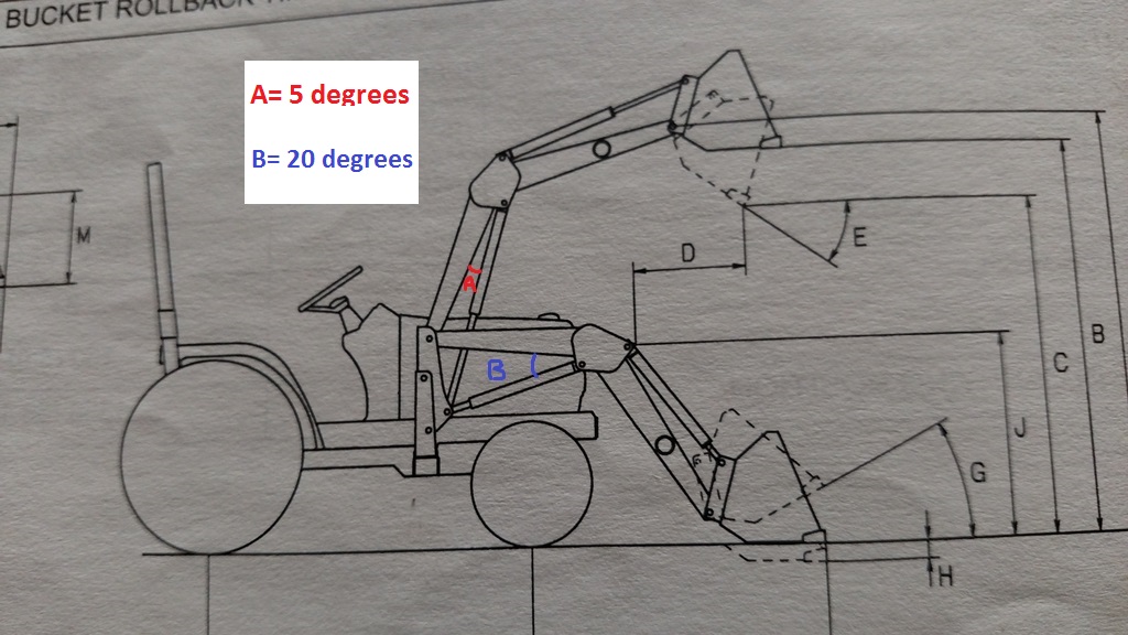 On an 20 degree cylinder to arm angle, only 0.342 (or 32.4%) of that is used for vertical force. That gives 3950# upward push at the cylinder mounts at ground level. (Loader cant actually lift that obviously, cause factors such as the dead weight of the bucket and frame, plus the leverage effect. Bucket is pretty far out in front of the cylinder pushing points.
