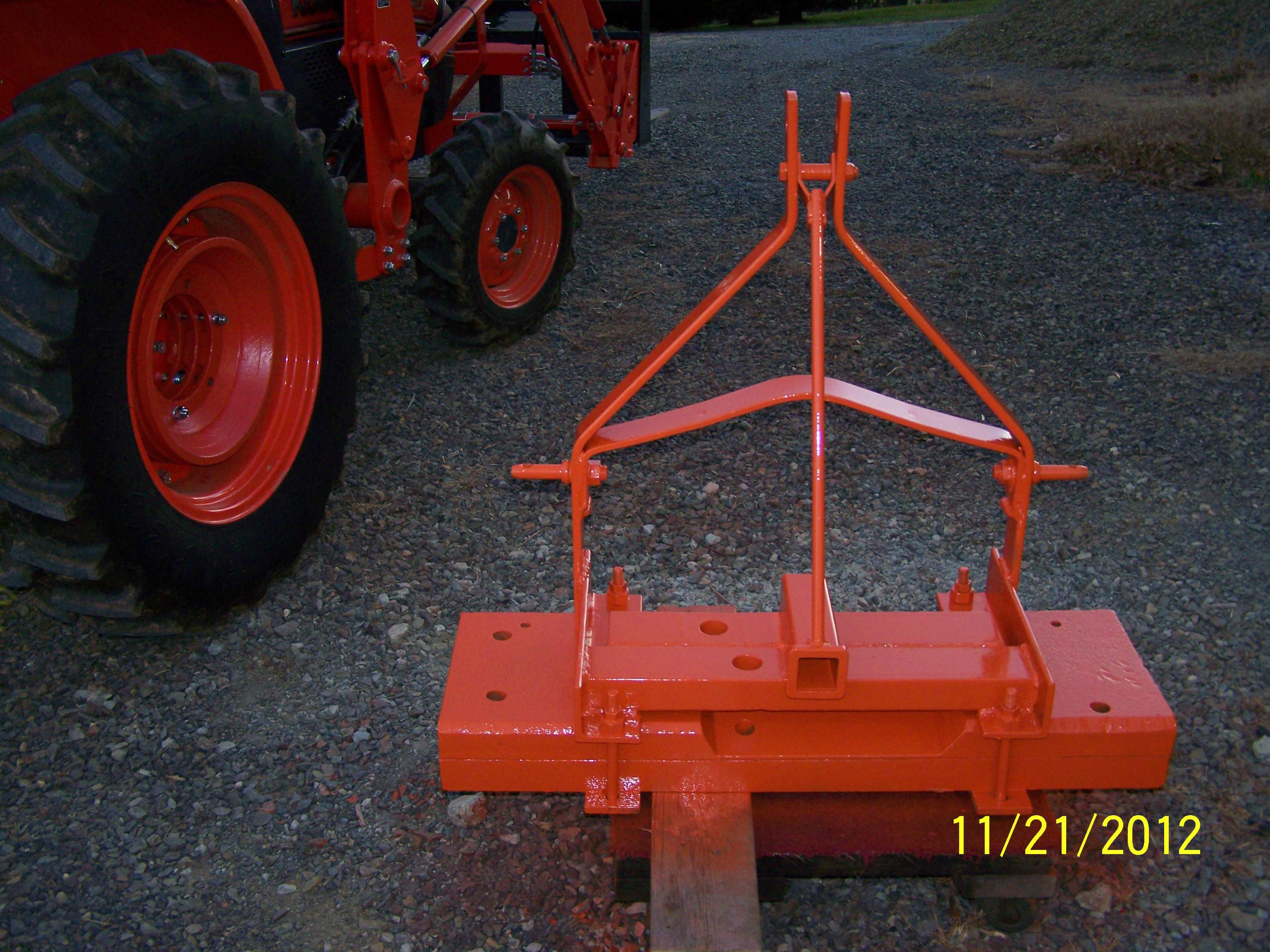 k0ua, the 3pt attachment is off of a junked Bush Hog cutter, The 2 big chunks of iron on the bottom were given to me. I think they were part of a counterweight on a electric fork truck. Between the 3/8- 3X3 angle are two pcs. of 2 X 3.5 in. steel that I had lying around. I welded the reciever to them. The 5/8 rod was just overkill in case I need to lift a lot on the reciever. I thought about more bracing, but figured I'd see how it goes. When I get around to it, I'm going to add a basket to carry chains.