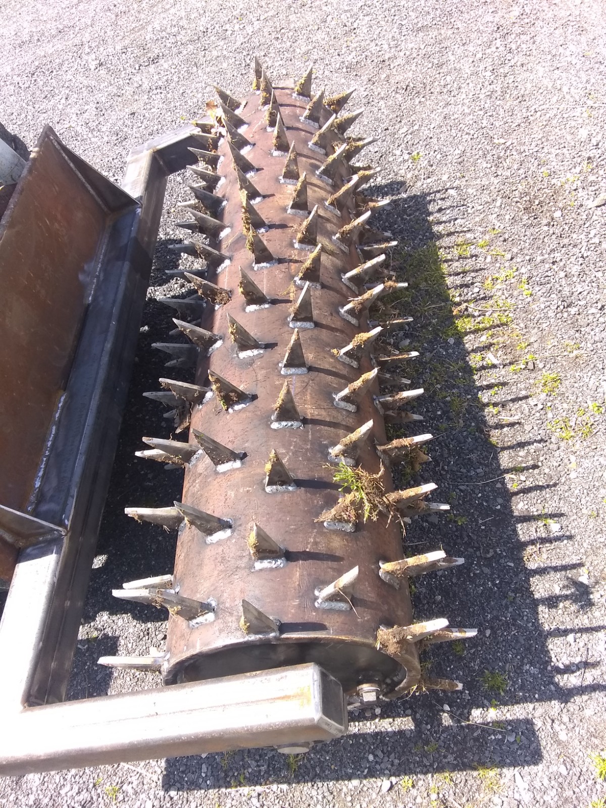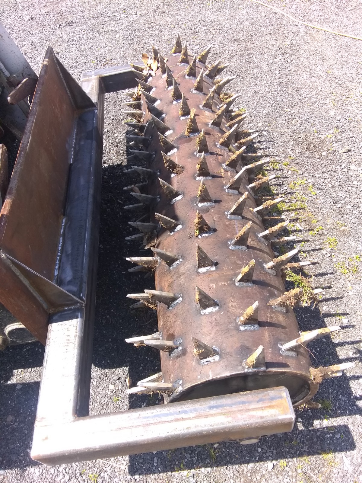 I didnt build a roller, but its kinda close :) This was a 16" piece of sch. 80 pipe. It is now my new pasture aerator (yes I can fill with water, if needed) I cut out the end plates then found center and mounted my stub axles. The bearings are frame mounted using the same spacing off of the main tube. The tines are placed in a v-shape and are 1/2" plate, 4" long View attachment 647667View attachment 647665View attachment 647663View attachment 647664