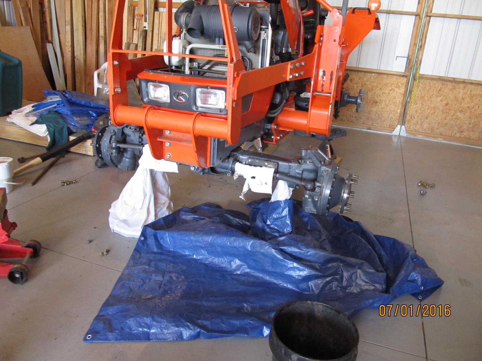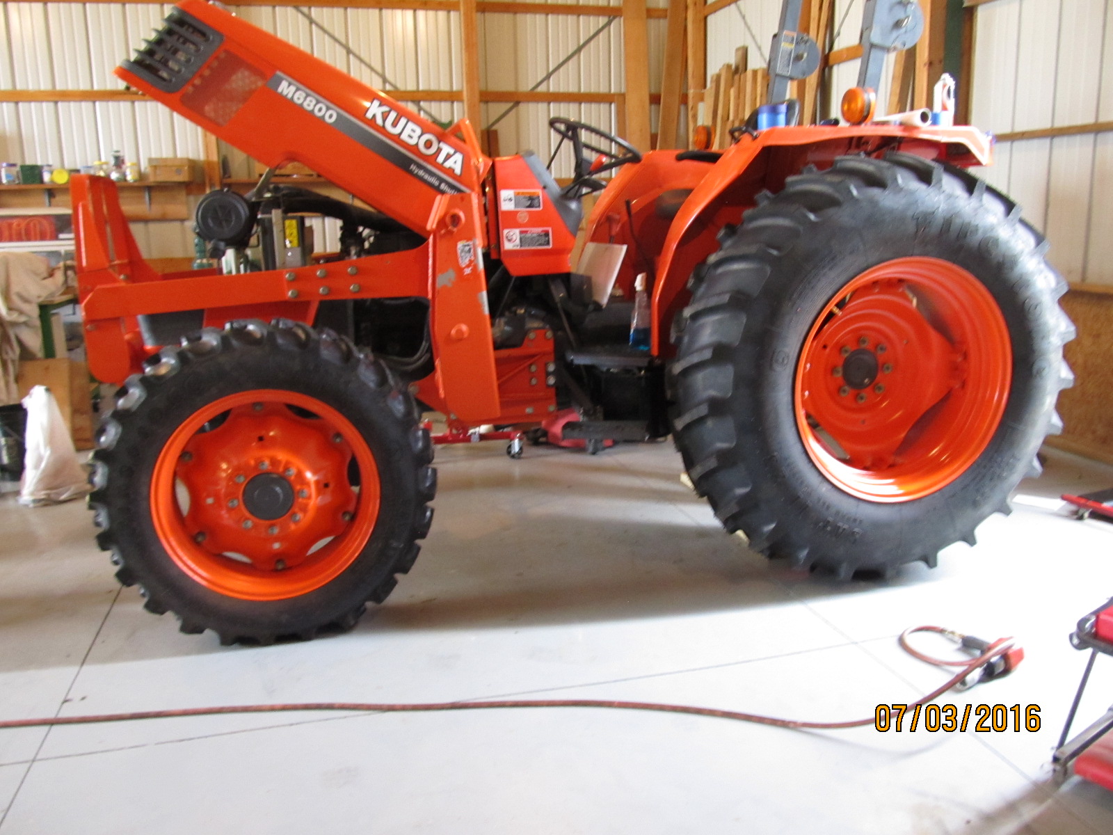 Below is a photo of an M6800 Kubota I recently bought an auction. It sat outside for 14 years (!)--ugh--but only had 400 hours on it. It had a big plus of hydraulic shuttle shift, draft control, adjustable link ends, deluxe seat, loader and rear weights. Most important, it was owned by a meticulous 95 year old guy that changed the fluids and maintained it while only mowing grass with it. Best of all, he drilled no holes, added no whip aerials or fog horns or crap that would be hard to repair. Plus, he had the insight to at least tarp the seat. This is my kind of raw material and I bought it. I've wanted an M6800 for years.