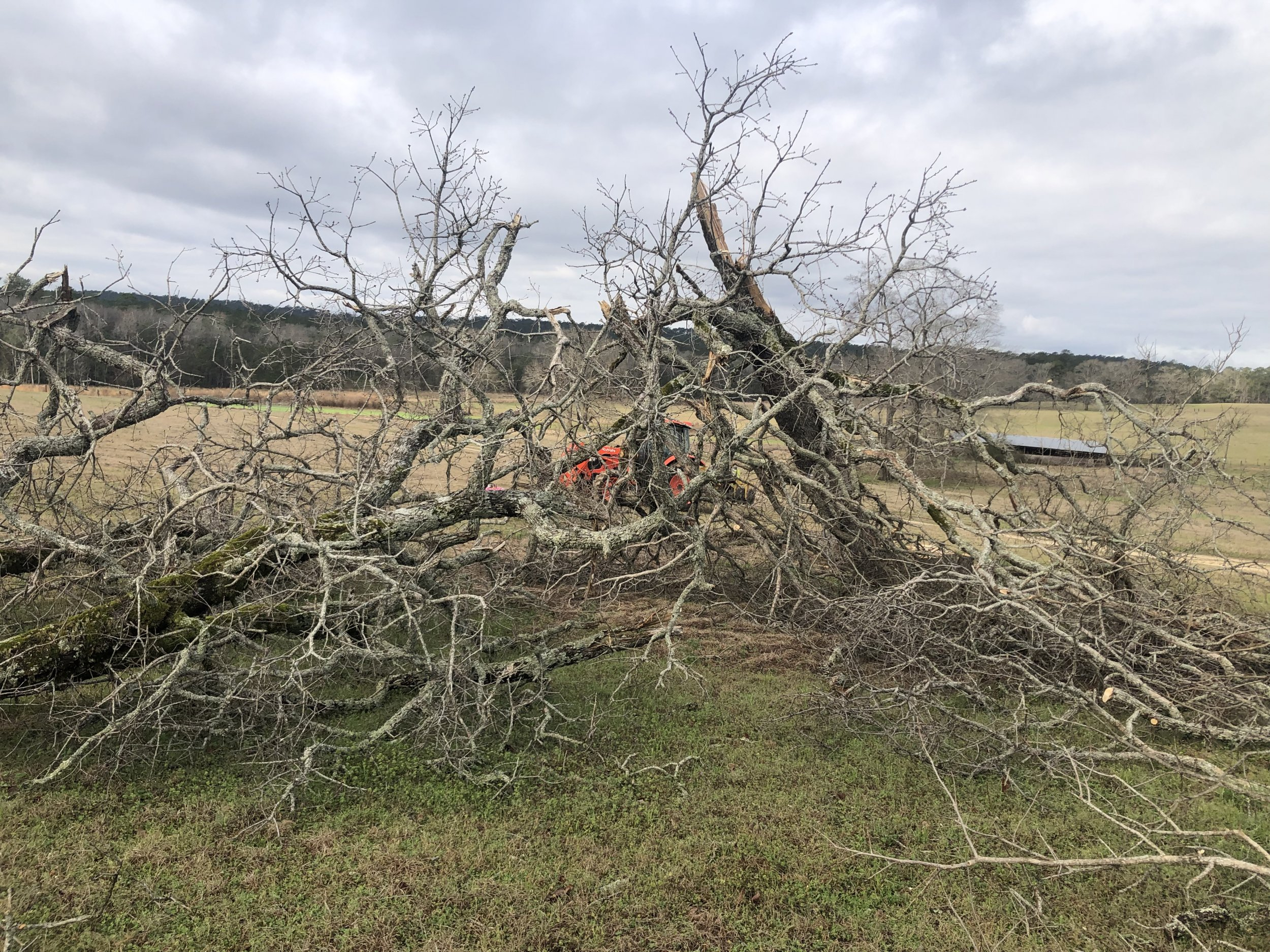 2. Standing on the berm with a powered pole saw, undercut the trunk on one side of the berm, whichever side is most convenient to work.