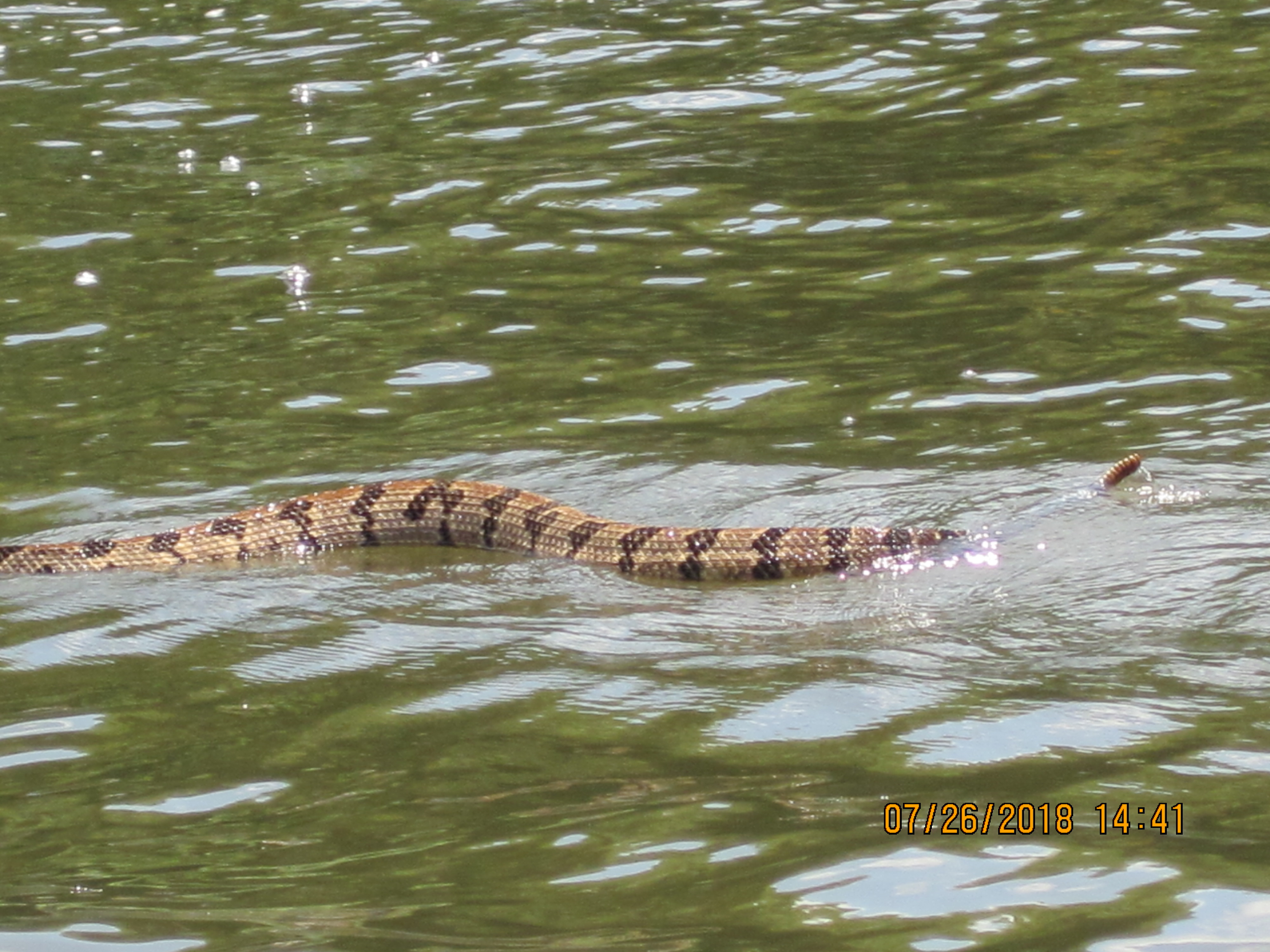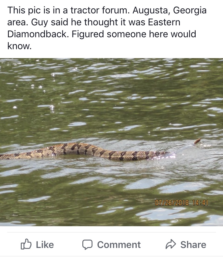 My wife and I where out on the Savannah River yesterday and she came upon something I have never seen before a swimming rattle snake. Hard to tell by the attached pictures but it was a good sized, about 4-feet long, what I think was an eastern diamond back although it may have been a light colored timber rattler. Snake was perfectly comfortable in the water stopping several times to check us out when we got to close. This spot is about 40-miles downriver from Augusta and nothing but woods and farmland on either side and about 100-yards across.