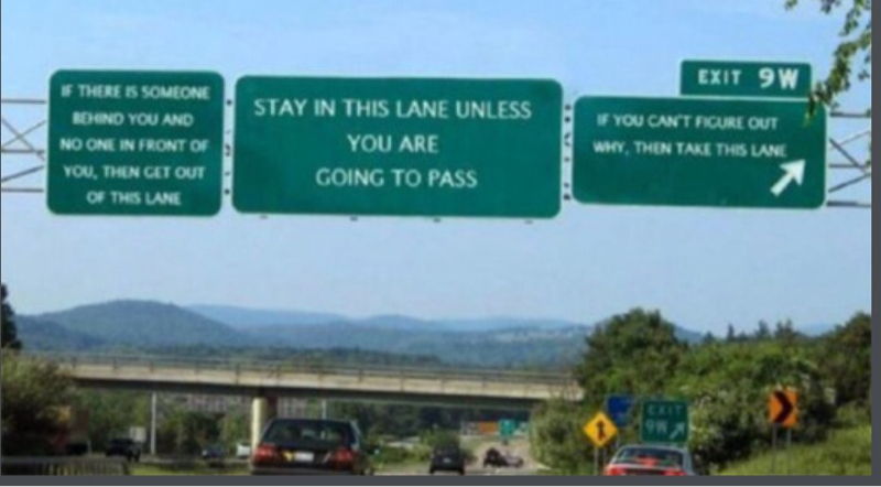 In addition to the left lane residents, we also have a problem here with people clogging up the rightmost lane on a 3- or 4-lane highway. The way I was taught, that rightmost lane is supposed to be for people exiting or entering the highway. Well, around here, people use it as a travel lane, often going way under the speed limit. Almost every day I commute to work, I have to practically play bumper cars to get into that right lane to exit the highway. It's ridiculous. That exit serves an Air Force base and a business park, so a lot of people use it going to work. Yet whenever I exit, I'd say at least 3-4 cars in front of me and 3-4 in back keep on going. Next exit is 2-3 miles away and not a busy exit. I am convinced these must be dopes that just get on the highway and stay in that lane for days....
