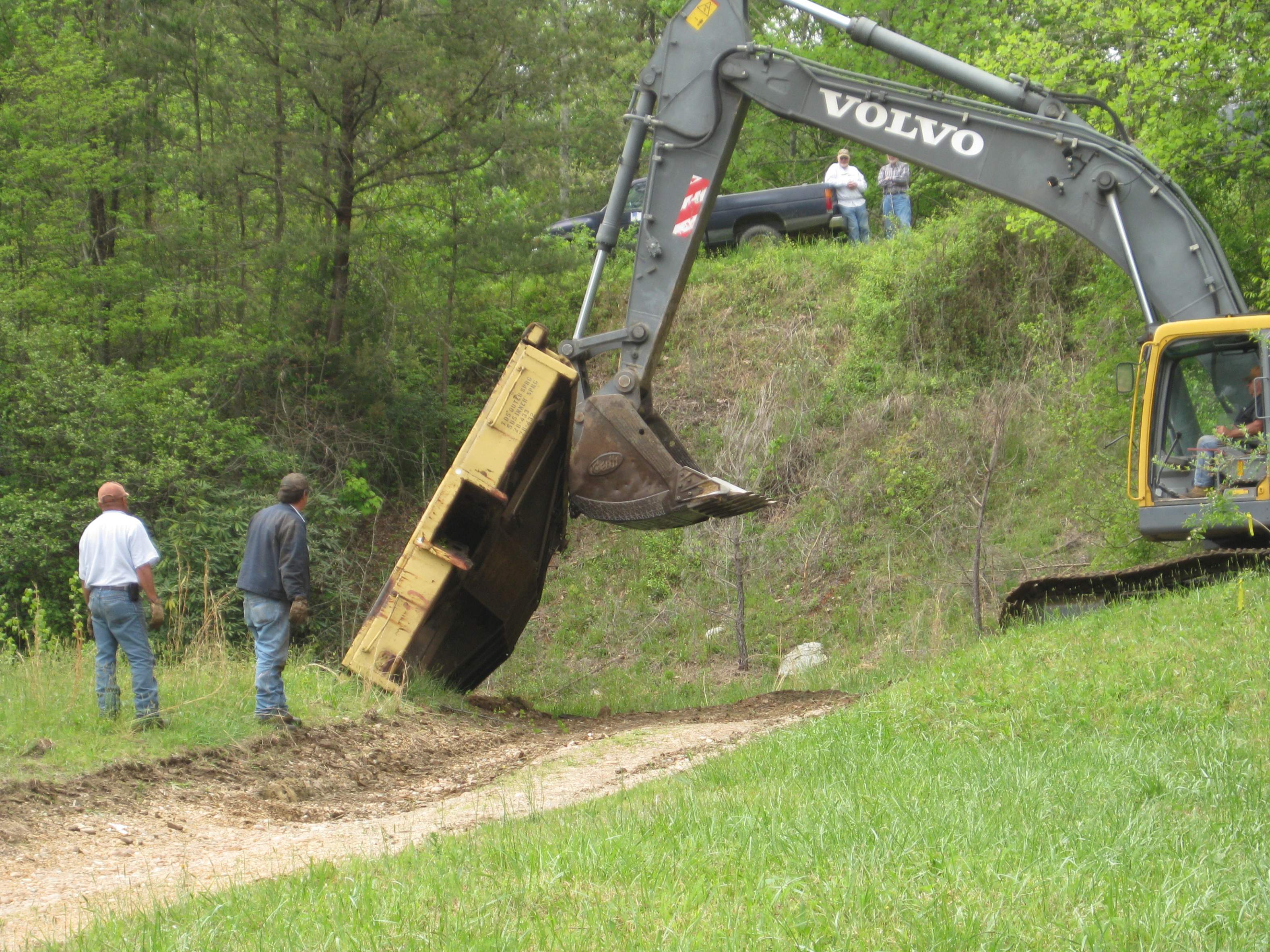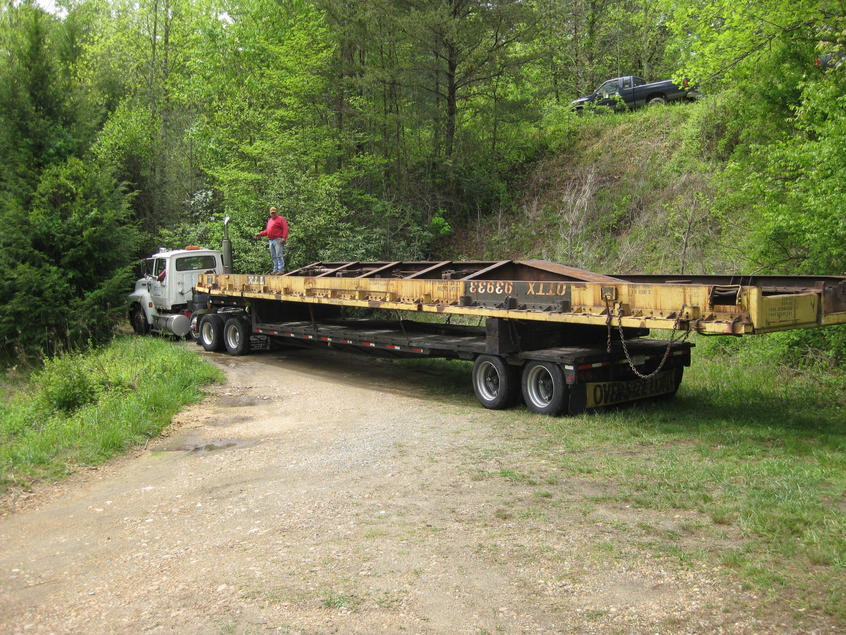 Well folks, we have a bridge! This past week the contractor made it to the river and in less than a day we had a bridge installed across the river. The contractor brought a large excavator with him to install the 60' flatcar. In just a few hours he had unloaded the flatcar, placed it across the river, dug the footings, installed the H Beams, and poured the 30 yards of concrete. What a day, it really went well and everyone was really pleased with the end result. Next is the re-decking project. We are going to use Marston mats which will be bolted to the superstructure of the the flatcar.