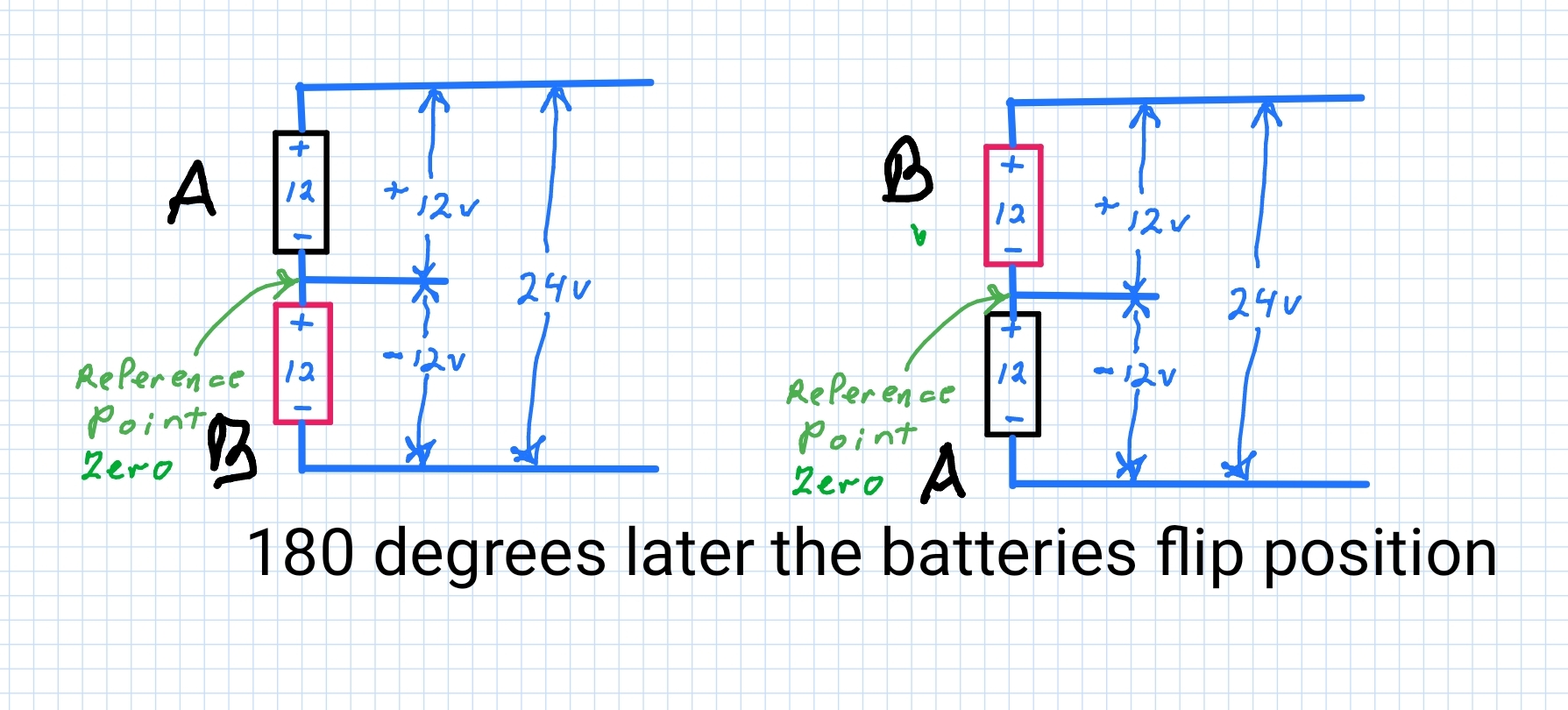 For your DC examples I would question the assertion that the batteries flip position, and instead suggest that they flip polarity (in unison) - for an AC equivalent.