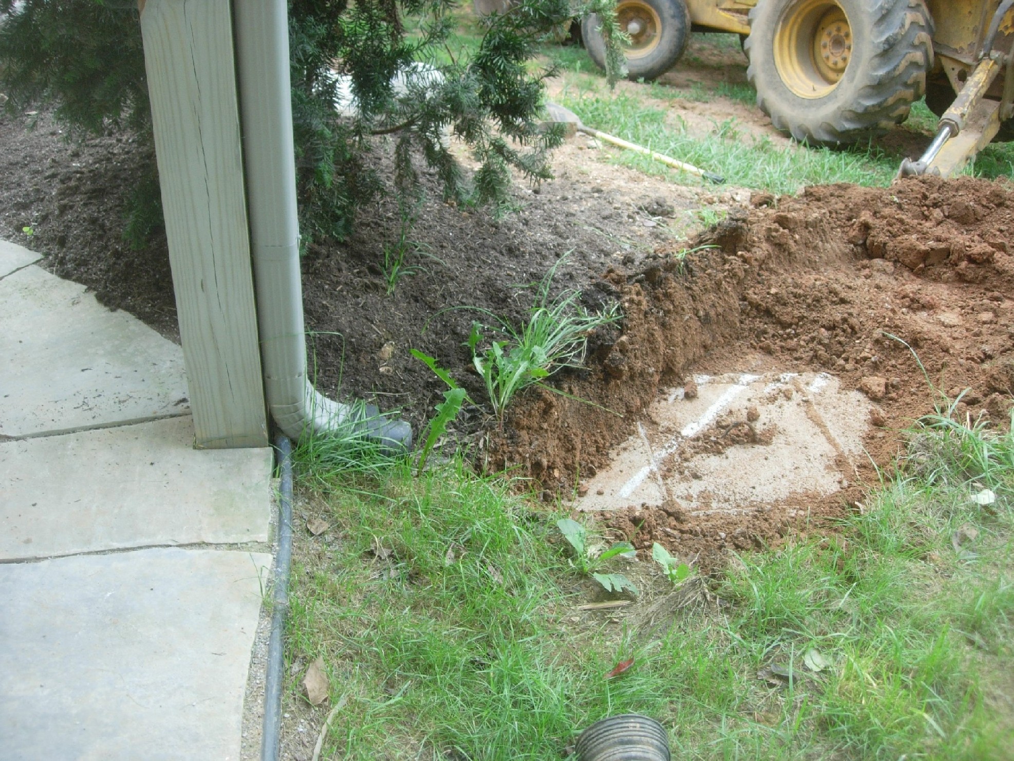 What I've done on the other 3 corners of the house was to dig down maybe 12" or so and lay a run of scheduel 40 solid pipe. I'm wanting to do the same thing here, especially the Sch-40 since I cut the yard with a tractor... I want to be sure to not compress a corregated type drainpipe.
