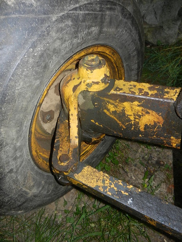 9. Before we cut the Kingpin, he welded a spare loader bucket tooth I had to the top of it to see if we could rotate the Kingpin.... brought my neighbors John Deere (?? about 40 HP) and attached my chain to the now, perpendicular tooth.... he pulled forward and rather than rotating pin, it pulled tooth off, TWICE. THEN I decided to just cut the SOB.