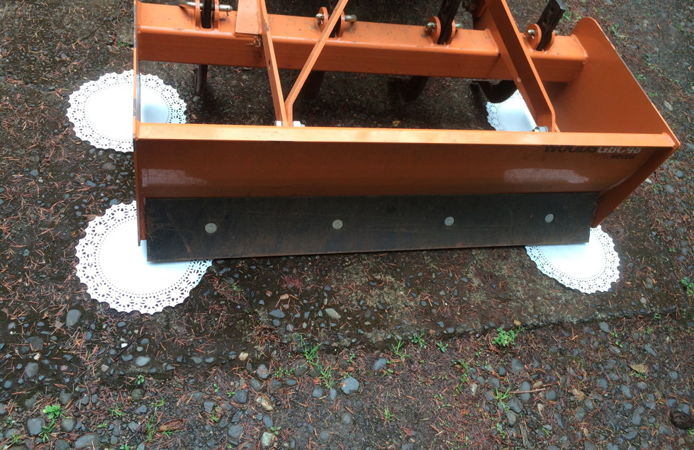 Now park them either in carriage house or garage with dollies under most. One similar to a furniture dolly is good enough for the Mac chipper/shredder. Just castors underneath the carryall do. Use a 2x6 with 3 METAL castors underneath both ends of it for the front end of the bush hog. The back blade is light enough to manage without anything. Prop it up against the garage wall in front of the Tacoma until bad weather is forecast.